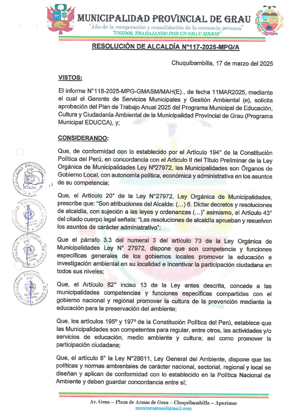 La presente Resolución de Alcaldía aprueba el Plan de Trabajo 2025 del Programa Municipal de Educación, Cultura y Ciudadanía Ambiental de la Municipalidad Provincial de Grau - (Apurímac), con la finalidad de definir las actividades de educación, cultura y ciudadanía ambiental que se desarrollaran en la localidad durante el presente año.