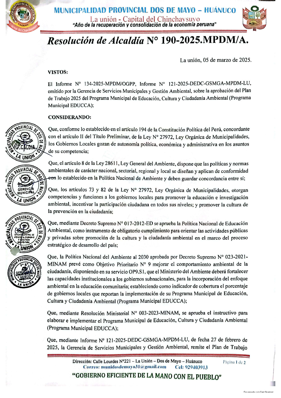 La presente Resolución de Alcaldía aprueba el Plan de Trabajo 2025 del Programa Municipal de Educación, Cultura y Ciudadanía Ambiental de la Municipalidad Provincial de Dos de Mayo - (Huánuco), con la finalidad de definir las actividades de educación, cultura y ciudadanía ambiental que se desarrollaran en la localidad durante el presente año.