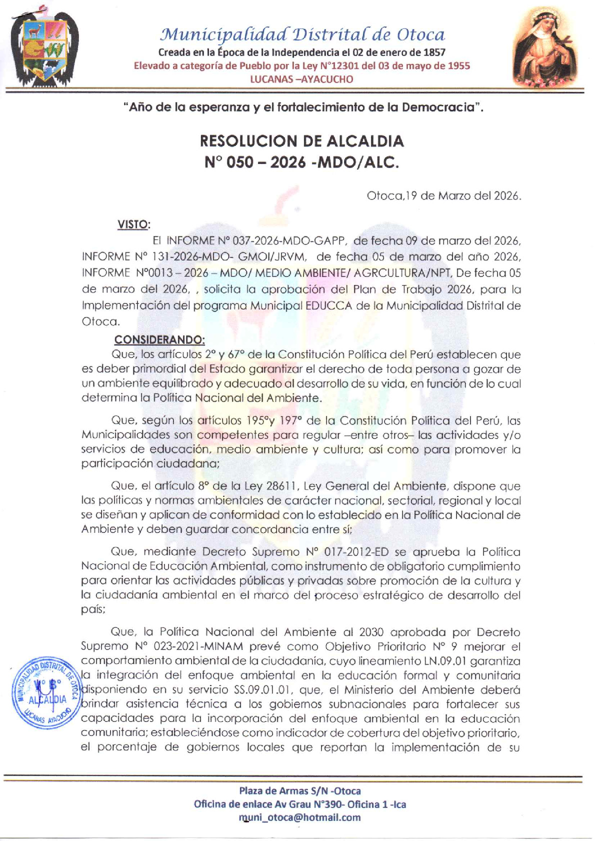 La presente Resolución de Alcaldía aprueba el Plan de Trabajo 2026 del Programa Municipal de Educación, Cultura y Ciudadanía Ambiental de la Municipalidad Distrital de Otoca - Lucanas (Ayacucho), con la finalidad de definir las actividades de educación, cultura y ciudadanía ambiental que se desarrollarán en la localidad durante el presente año.