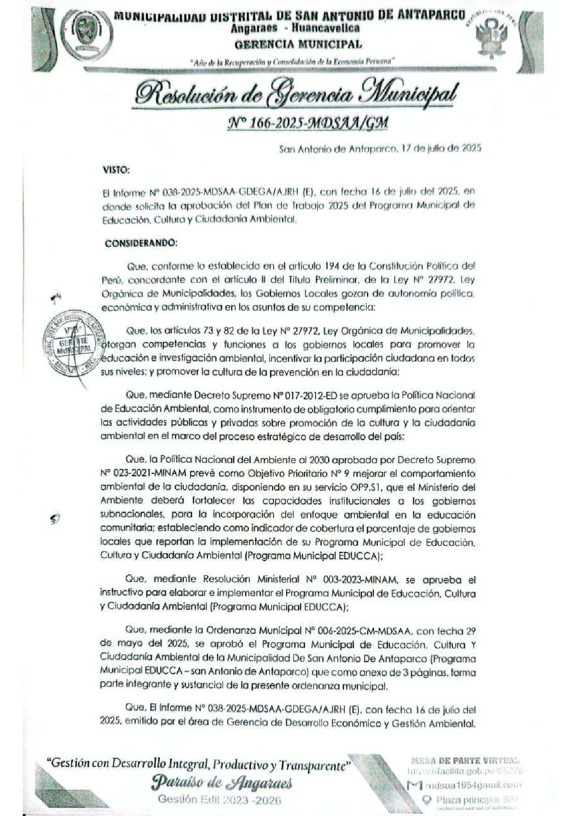 La presente Resolución de Gerencia Municipal aprueba el Plan de Trabajo 2025 del Programa Municipal de Educación, Cultura y Ciudadanía Ambiental de la Municipalidad Distrital de San Antonio de Antaparco - Angaraes (Huancavelica), con la finalidad de definir las actividades de educación, cultura y ciudadanía ambiental que se desarrollarán en la localidad durante el presente año.
