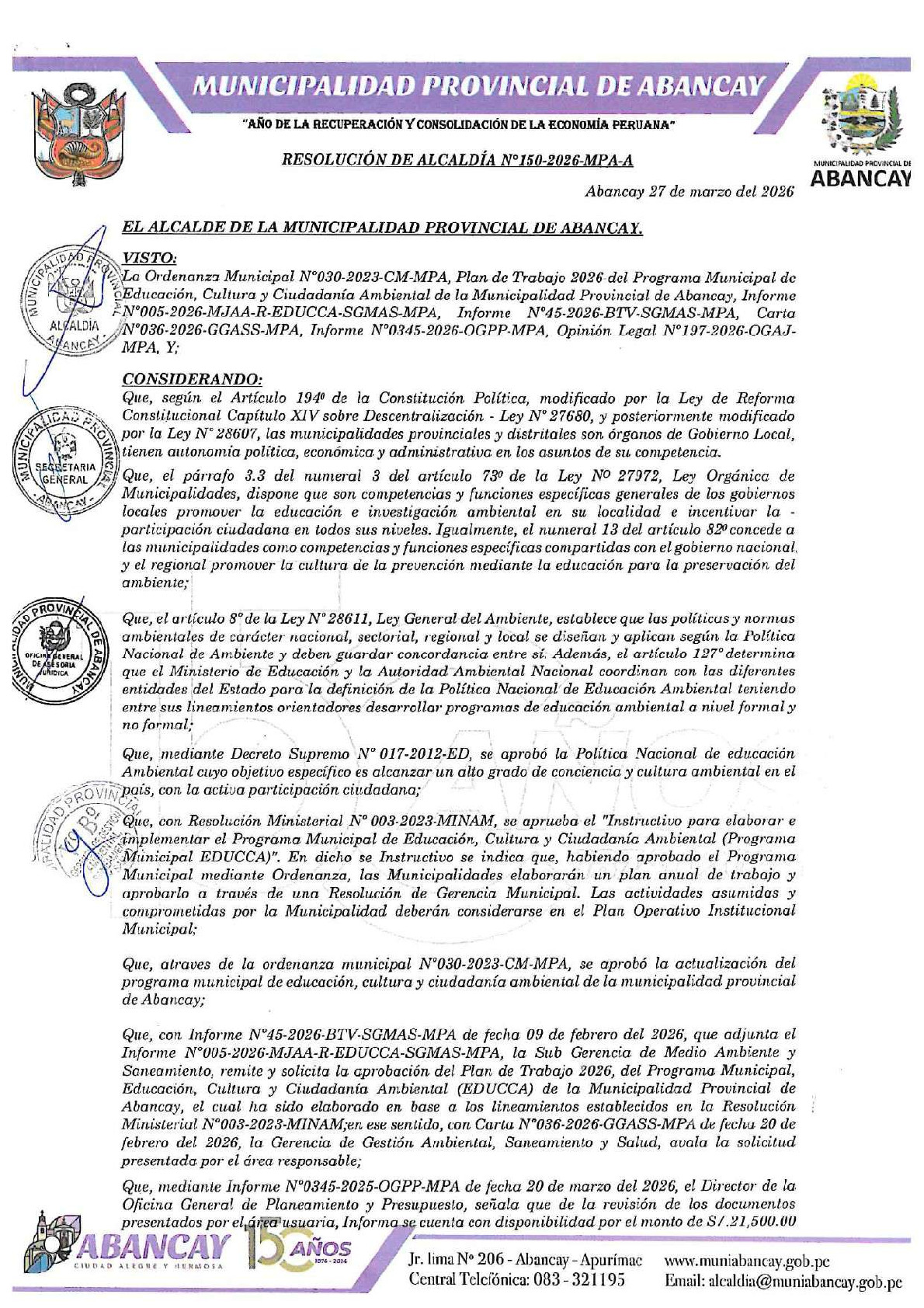 La presente Resolución de Alcaldia aprueba el Plan de Trabajo 2026 del Programa Municipal de Educación, Cultura y Ciudadanía Ambiental de la Municipalidad Provincial de Abancay (Apurímac), con la finalidad de definir las actividades de educación, cultura y ciudadanía ambiental que se desarrollarán en la localidad durante el presente año.