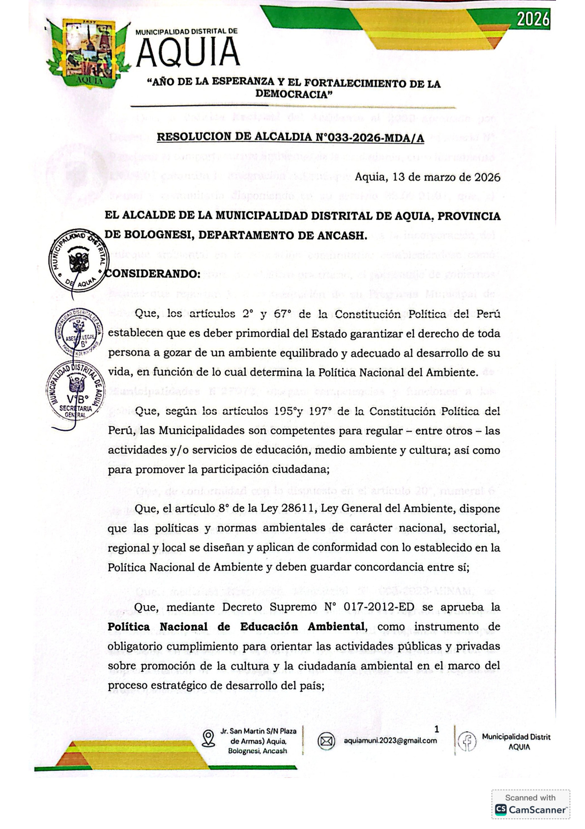La presente Resolución de Alcaldia aprueba el Plan de Trabajo 2026 del Programa Municipal de Educación, Cultura y Ciudadanía Ambiental de la Municipalidad Distrital de Aquia (Bolognesi - Ancash), con la finalidad de definir las actividades de educación, cultura y ciudadanía ambiental que se desarrollarán en la localidad durante el presente año.