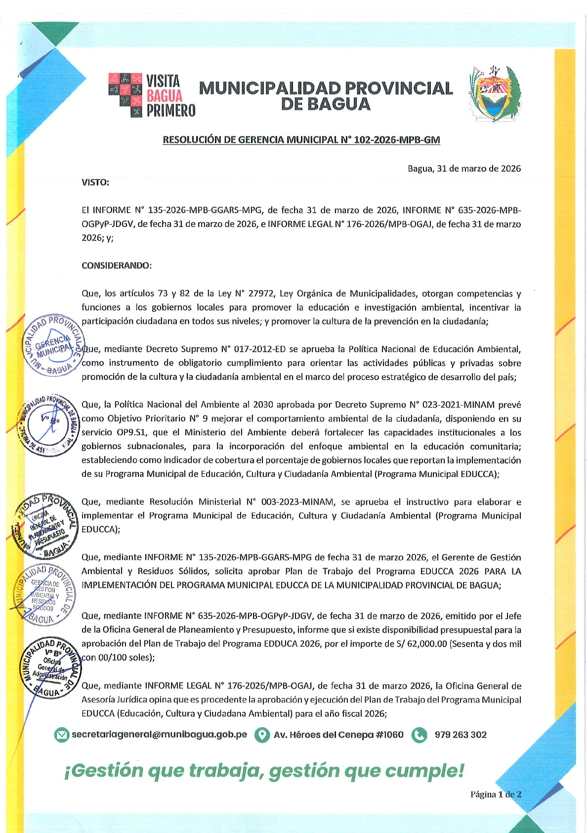 La presente Resolución de Gerencia Municipal aprueba el Plan de Trabajo 2026 del Programa Municipal de Educación, Cultura y Ciudadanía Ambiental de la Municipalidad Provincial de Bagua (Amazonas), con la finalidad de definir las actividades de educación, cultura y ciudadanía ambiental que se desarrollarán en la localidad durante el presente año.