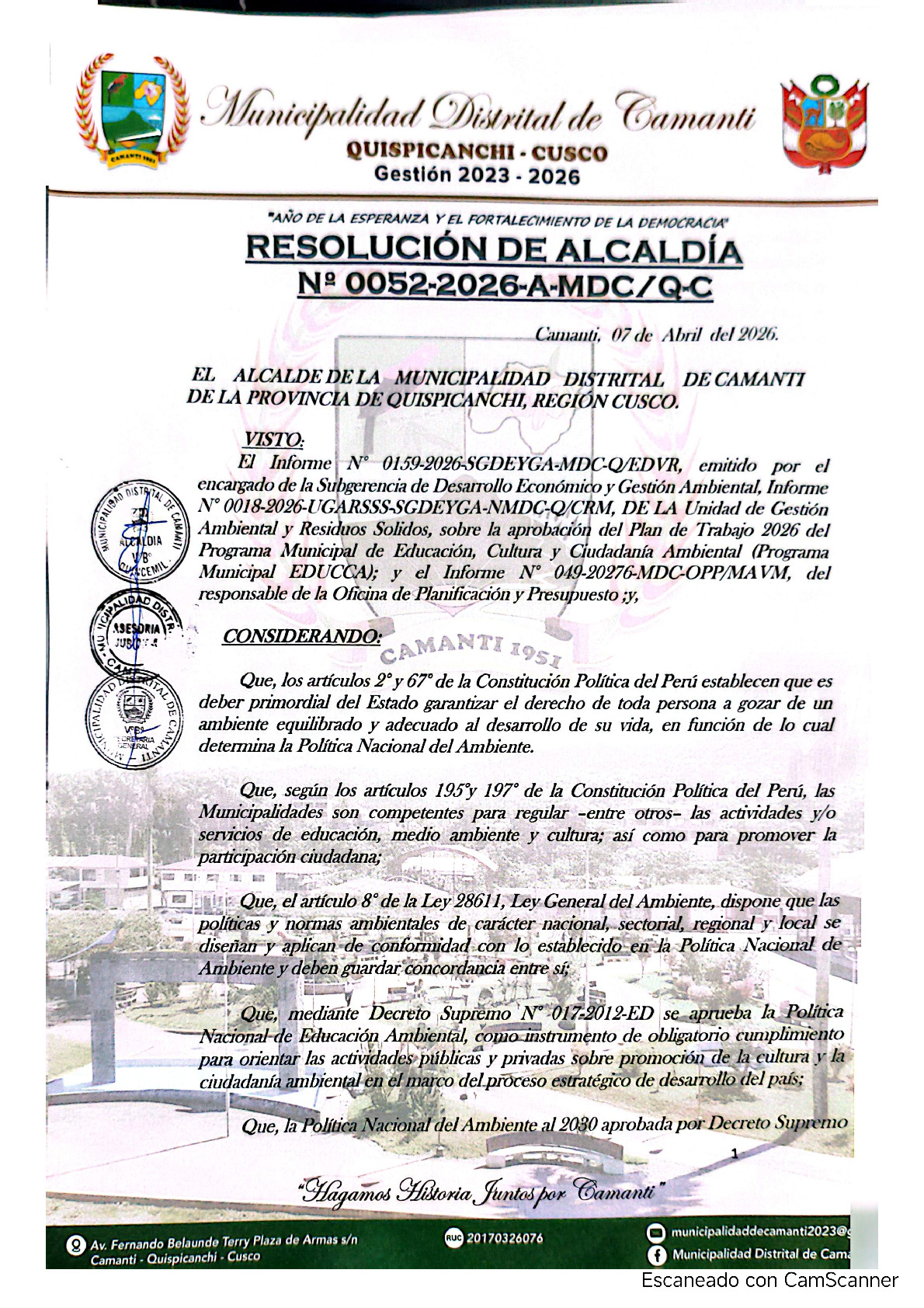 La presente Resolución de Alcaldía aprueba el Plan de Trabajo 2026 del Programa Municipal de Educación, Cultura y Ciudadanía Ambiental de la Municipalidad Distrital de Camanti - Quispicanchi (Cusco), con la finalidad de definir las actividades de educación, cultura y ciudadanía ambiental que se desarrollarán en la localidad durante el presente año.