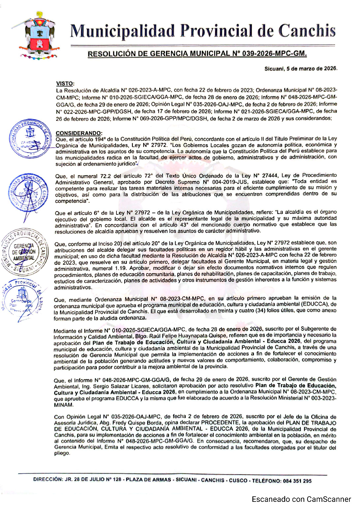 La Resolución de Gerencia Municipal aprueba el Plan de Trabajo 2026 del Programa Municipal de Educación, Cultura y Ciudadanía Ambiental de la Municipalidad Provincial de Canchis - Canchis (Cusco), con la finalidad de definir las actividades de educación, cultura y ciudadanía ambiental que se desarrollarán en la localidad durante el presente año.