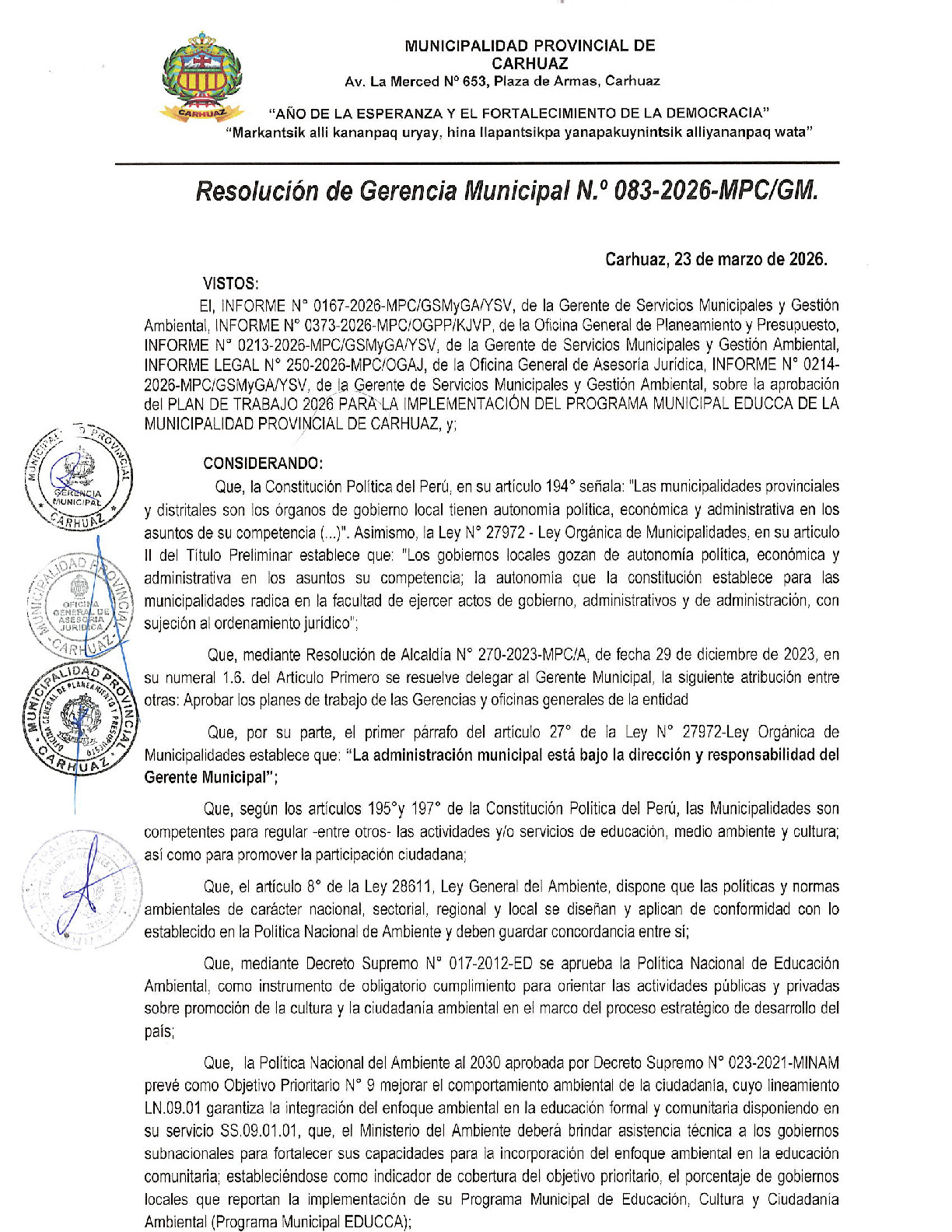 La presente Resolución de Gerencia Municipal aprueba el Plan de Trabajo 2026 del Programa Municipal de Educación, Cultura y Ciudadanía Ambiental de la Municipalidad Provincial de Carhuaz (Ancash), con la finalidad de definir las actividades de educación, cultura y ciudadanía ambiental que se desarrollarán en la localidad durante el presente año.