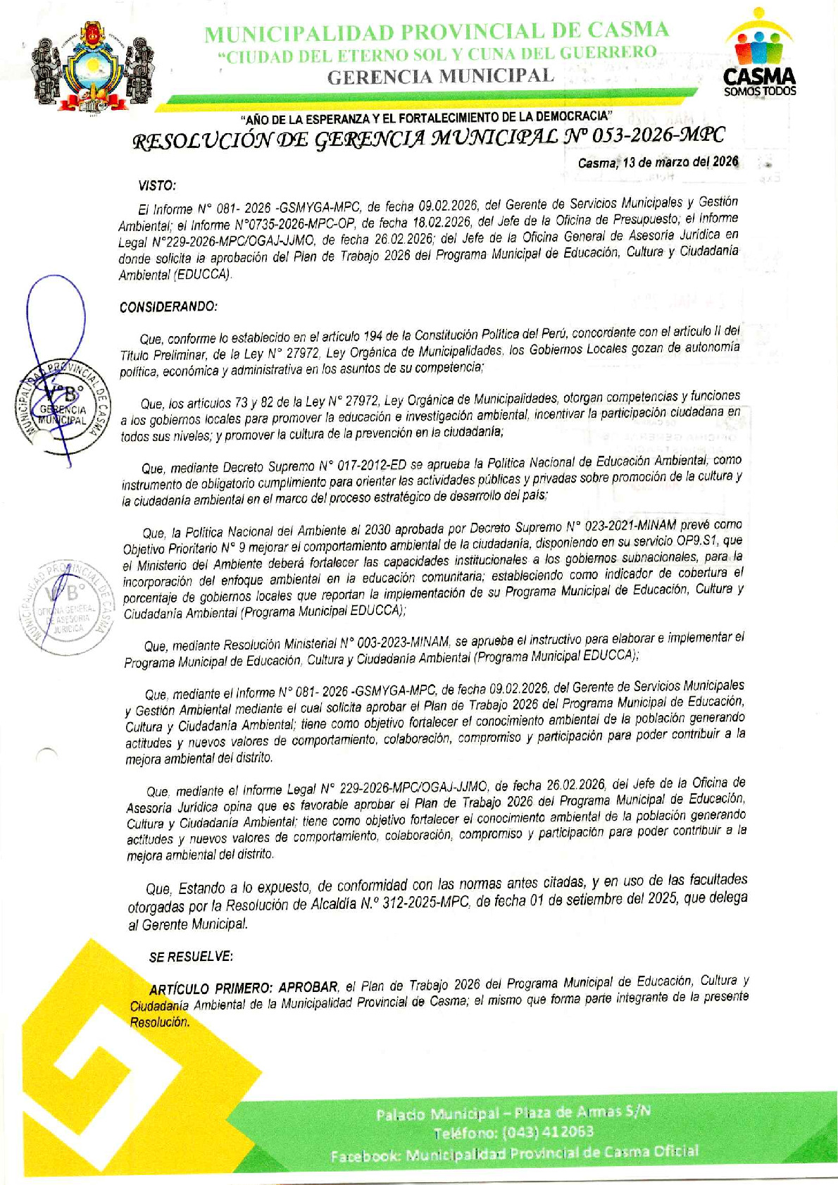 La presente Resolución de Gerencia Municipal aprueba el Plan de Trabajo 2026 del Programa Municipal de Educación, Cultura y Ciudadanía Ambiental de la Municipalidad Provincial de Casma (Ancash), con la finalidad de definir las actividades de educación, cultura y ciudadanía ambiental que se desarrollarán en la localidad durante el presente año.