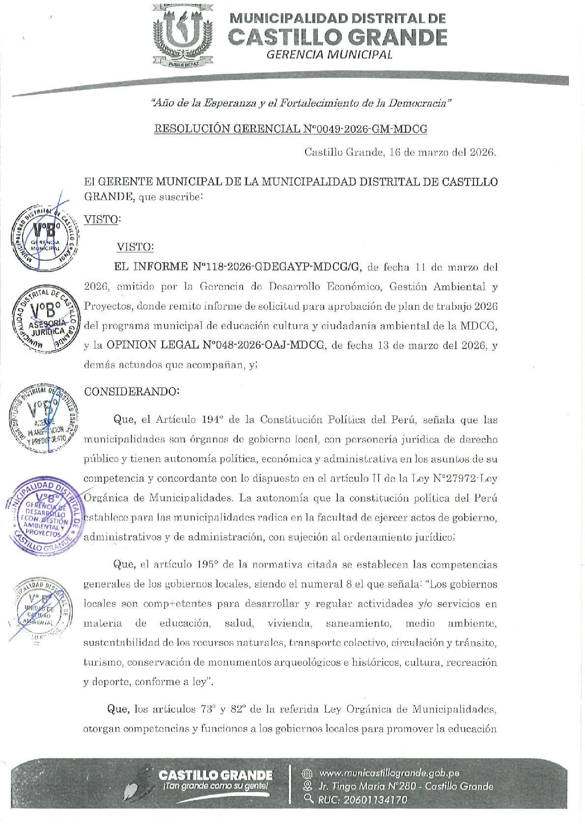 La presente Resolución de Gerencia Municipal aprueba el Plan de Trabajo 2026 del Programa Municipal de Educación, Cultura y Ciudadanía Ambiental de la Municipalidad Distrital de Castillo Grande (Leoncio Prado - Huanuco), con la finalidad de definir las actividades de educación, cultura y ciudadanía ambiental que se desarrollarán en la localidad durante el presente año.