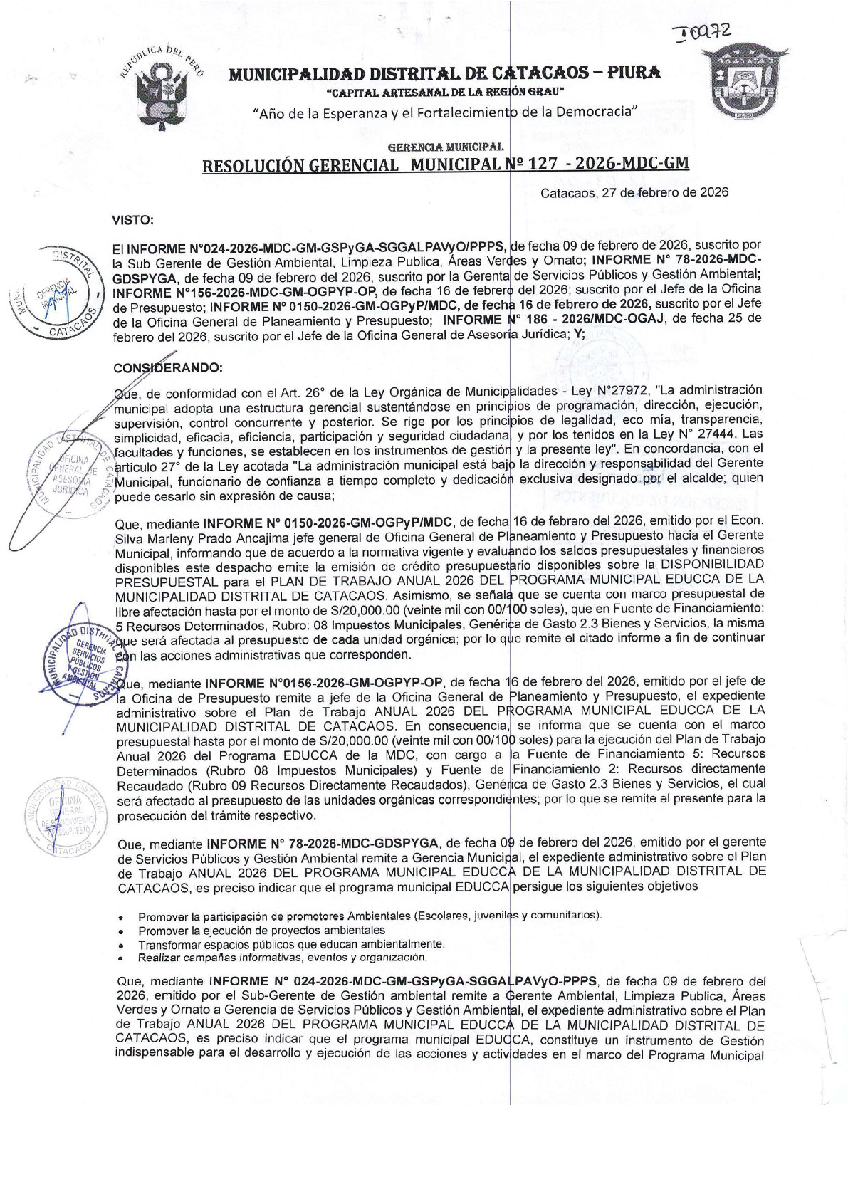 La presente Resolución de Gerencia Municipal aprueba el Plan de Trabajo 2026 del Programa Municipal de Educación, Cultura y Ciudadanía Ambiental de la Municipalidad Distrital de Catacaos (Piura -Piura), con la finalidad de definir las actividades de educación, cultura y ciudadanía ambiental que se desarrollarán en la localidad durante el presente año.