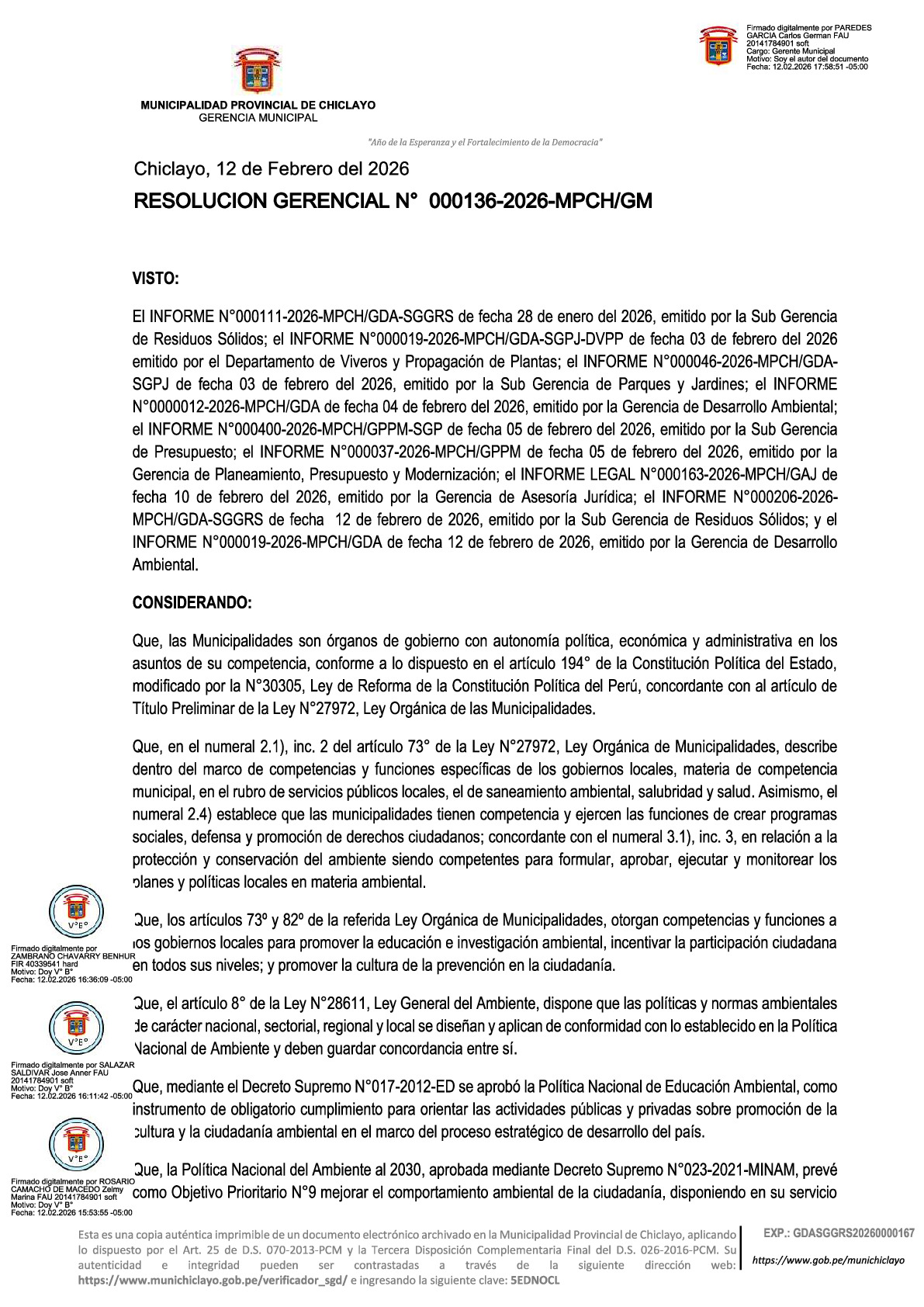 La presente Resolución de Gerencia Municipal aprueba el Plan de Trabajo 2026 del Programa Municipal de Educación, Cultura y Ciudadanía Ambiental de la Municipalidad Provincial de Chiclayo (Lambayeque), con la finalidad de definir las actividades de educación, cultura y ciudadanía ambiental que se desarrollarán en la localidad durante el presente año.