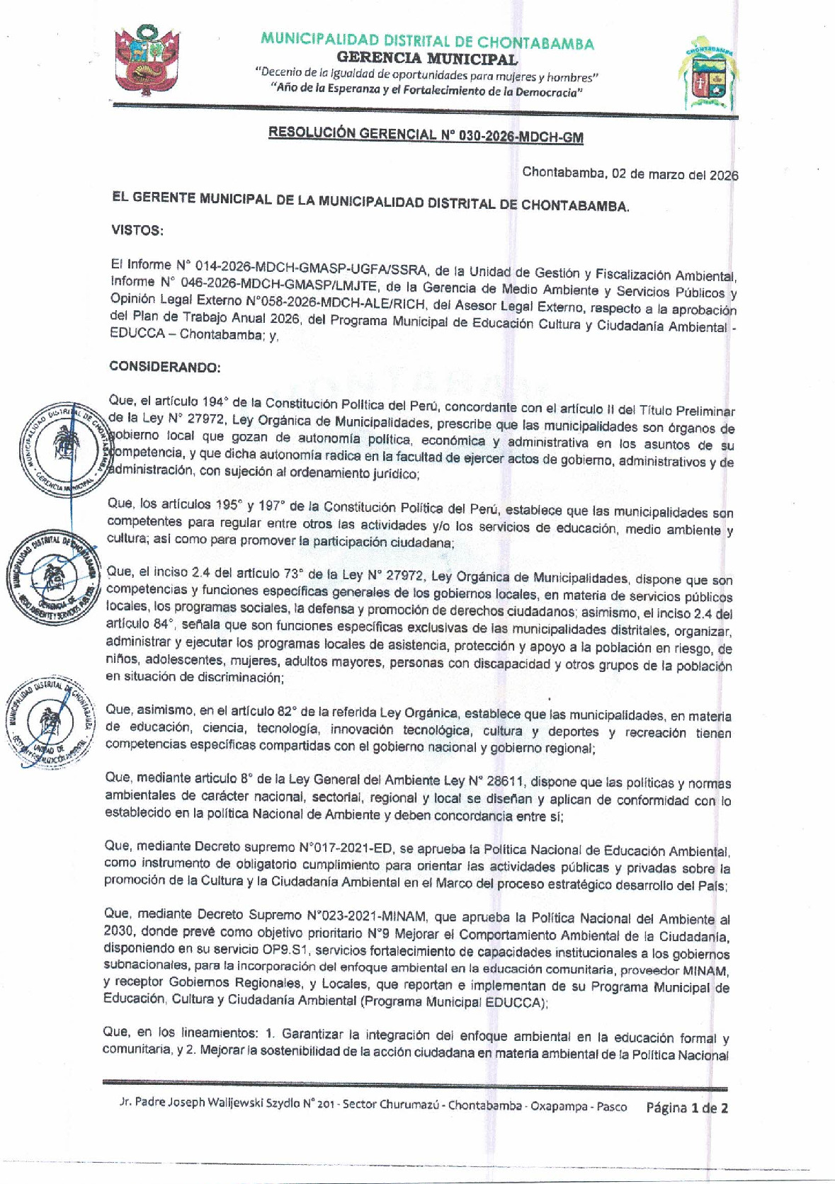 La presente Resolución de Gerencia Municipal aprueba el Plan de Trabajo 2026 del Programa Municipal de Educación, Cultura y Ciudadanía Ambiental de la Municipalidad Distrital de Chontabamba - Oxapampa (Pasco), con la finalidad de definir las actividades de educación, cultura y ciudadanía ambiental que se desarrollarán en la localidad durante el presente año.