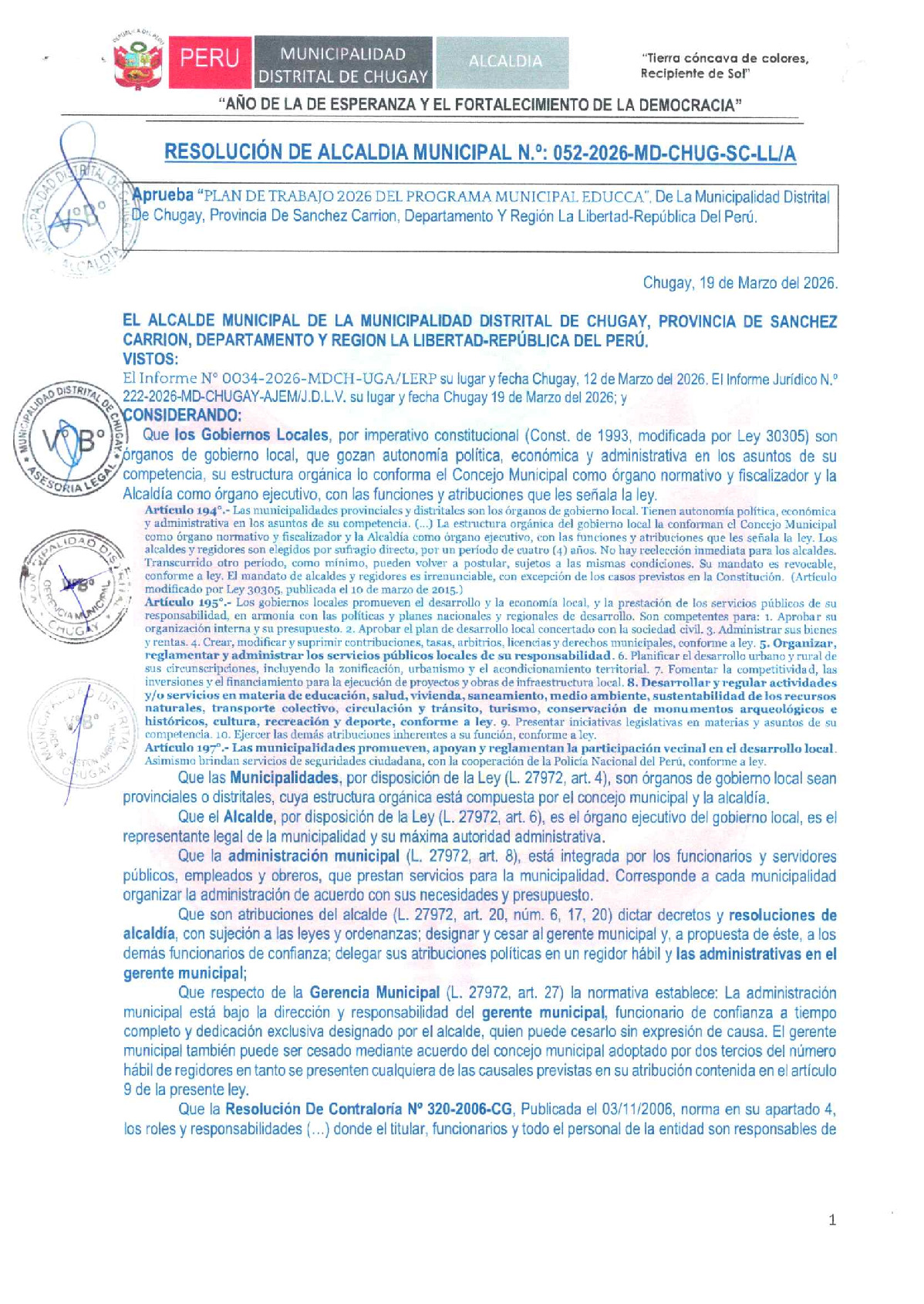 La presente Resolución de Alcaldia aprueba el Plan de Trabajo 2026 del Programa Municipal de Educación, Cultura y Ciudadanía Ambiental de la Municipalidad Distrital de Chugay (Sanchez Carrion - La Libertad), con la finalidad de definir las actividades de educación, cultura y ciudadanía ambiental que se desarrollarán en la localidad durante el presente año.