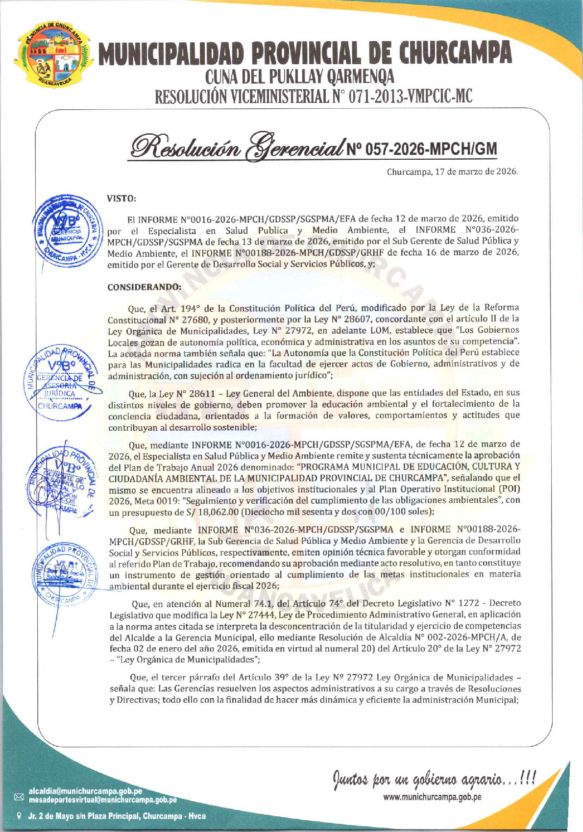 La presente Resolución de Gerencia Municipal aprueba el Plan de Trabajo 2026 del Programa Municipal de Educación, Cultura y Ciudadanía Ambiental de la Municipalidad Provincial de Churcampa - Churcampa (Huancavelica), con la finalidad de definir las actividades de educación, cultura y ciudadanía ambiental que se desarrollarán en la localidad durante el presente año.