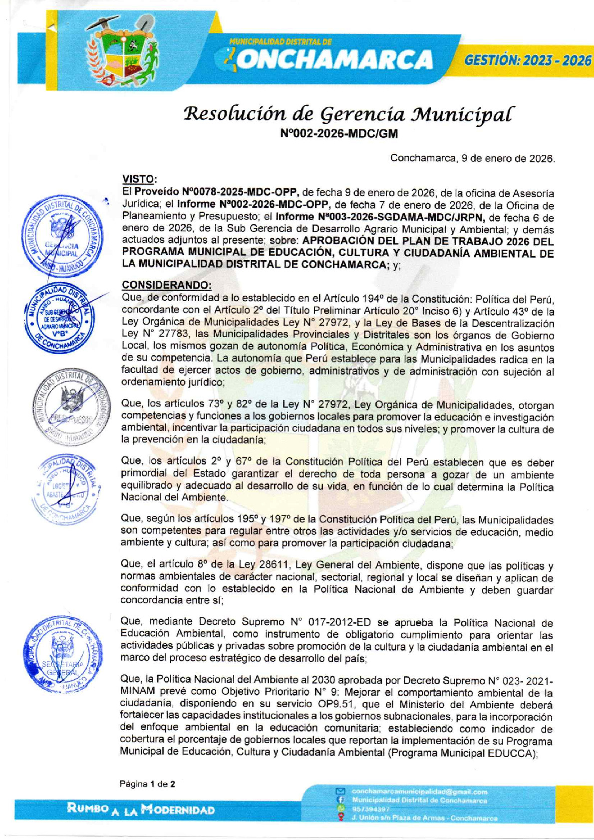 La presente Resolución de Alcaldía aprueba el Plan de Trabajo 2026 del Programa Municipal de Educación, Cultura y Ciudadanía Ambiental de la Municipalidad Distrital de Conchamarca (Ambo - Huánuco), con la finalidad de definir las actividades de educación, cultura y ciudadanía ambiental que se desarrollarán en la localidad durante el presente año.