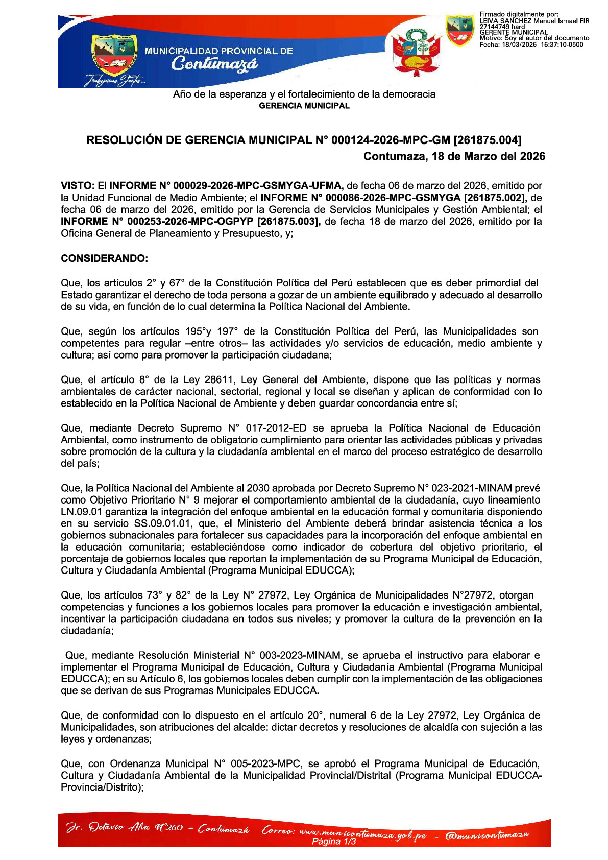 La presente Resolución de Gerencia Municipal aprueba el Plan de Trabajo 2026 del Programa Municipal de Educación, Cultura y Ciudadanía Ambiental de la Municipalidad Provincial de Contumazá (Cajamarca), con la finalidad de definir las actividades de educación, cultura y ciudadanía ambiental que se desarrollarán en la localidad durante el presente año.