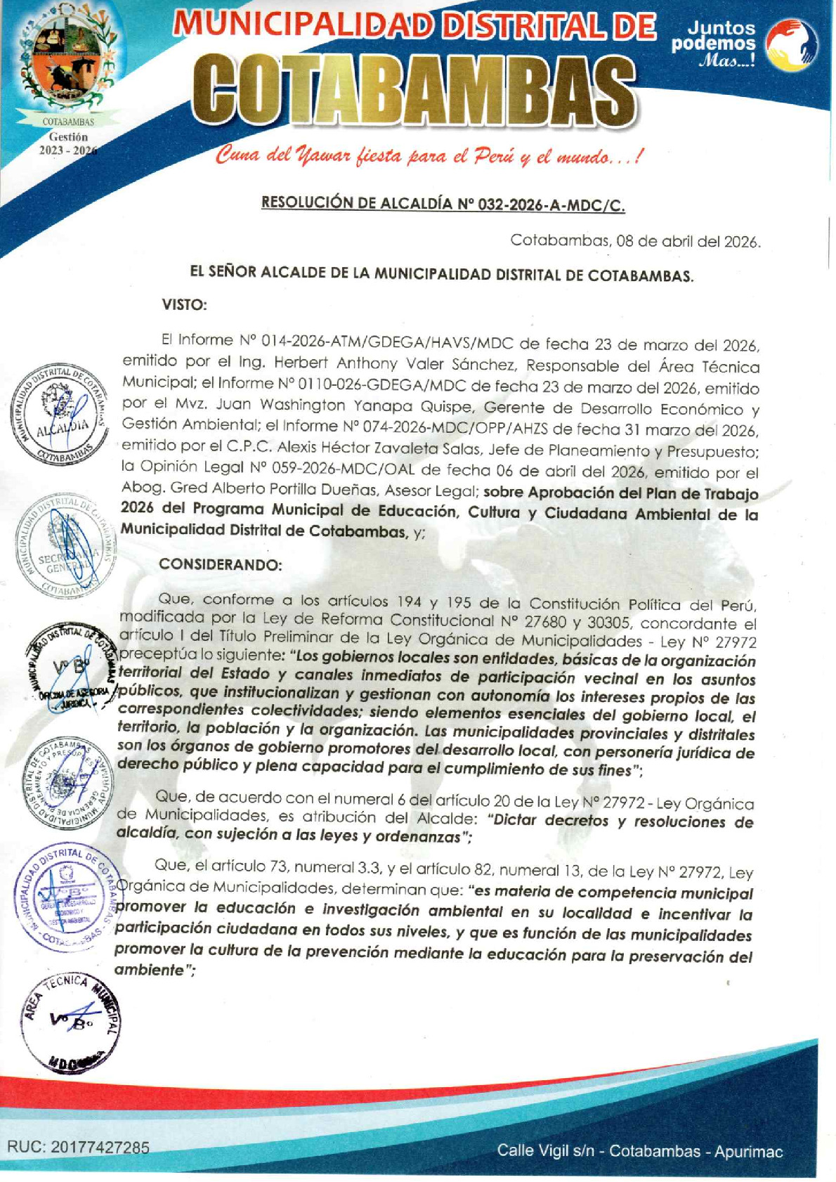 La presente Resolución de Alcaldia aprueba el Plan de Trabajo 2026 del Programa Municipal de Educación, Cultura y Ciudadanía Ambiental de la Municipalidad Distrital de Cotabambas (Cotabambas - Apurímac), con la finalidad de definir las actividades de educación, cultura y ciudadanía ambiental que se desarrollarán en la localidad durante el presente año.