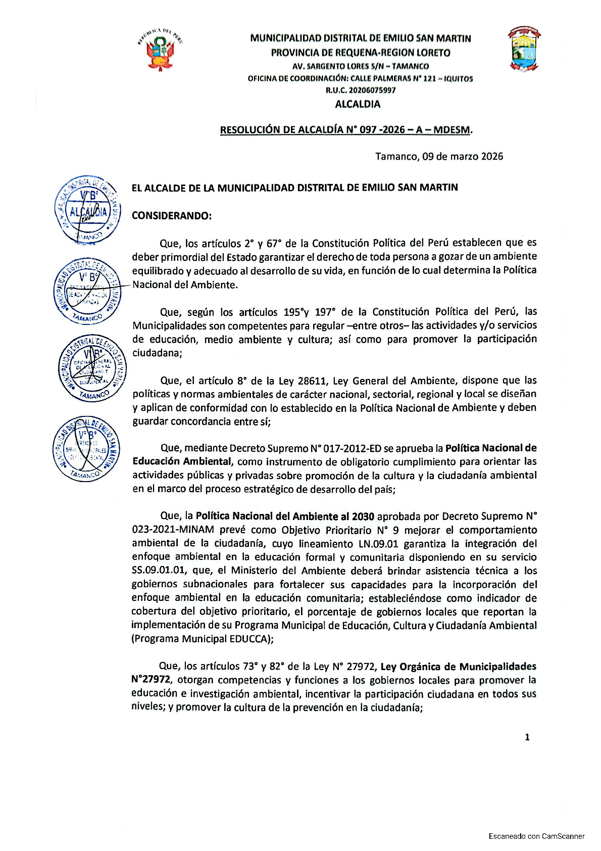 La presente Resolución de Alcaldia aprueba el Plan de Trabajo 2026 del Programa Municipal de Educación, Cultura y Ciudadanía Ambiental de la Municipalidad Distrital de Emilio San Martin (Requena - Loreto), con la finalidad de definir las actividades de educación, cultura y ciudadanía ambiental que se desarrollarán en la localidad durante el presente año.