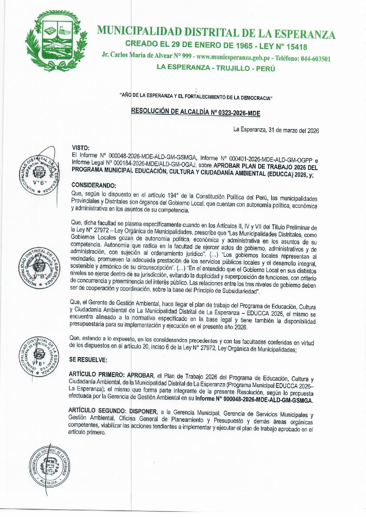 La presente Resolución de Alcaldia aprueba el Plan de Trabajo 2026 del Programa Municipal de Educación, Cultura y Ciudadanía Ambiental de la Municipalidad Distrital de La Esperanza (Trujillo - La Libertad), con la finalidad de definir las actividades de educación, cultura y ciudadanía ambiental que se desarrollarán en la localidad durante el presente año.