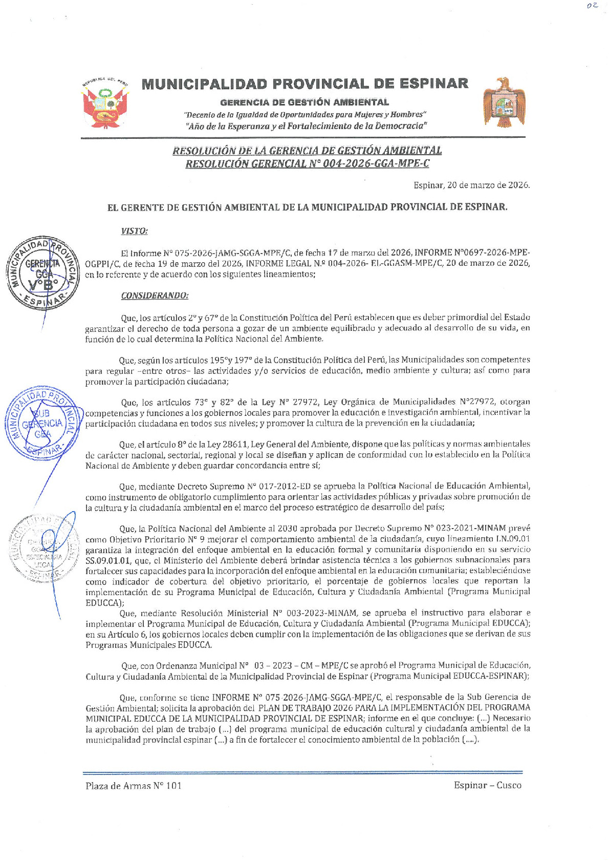La presente Resolución de Gerencia Municipal aprueba el Plan de Trabajo 2026 del Programa Municipal de Educación, Cultura y Ciudadanía Ambiental de la Municipalidad Provincial de Espina - Espinar (Cusco), con la finalidad de definir las actividades de educación, cultura y ciudadanía ambiental que se desarrollarán en la localidad durante el presente año.