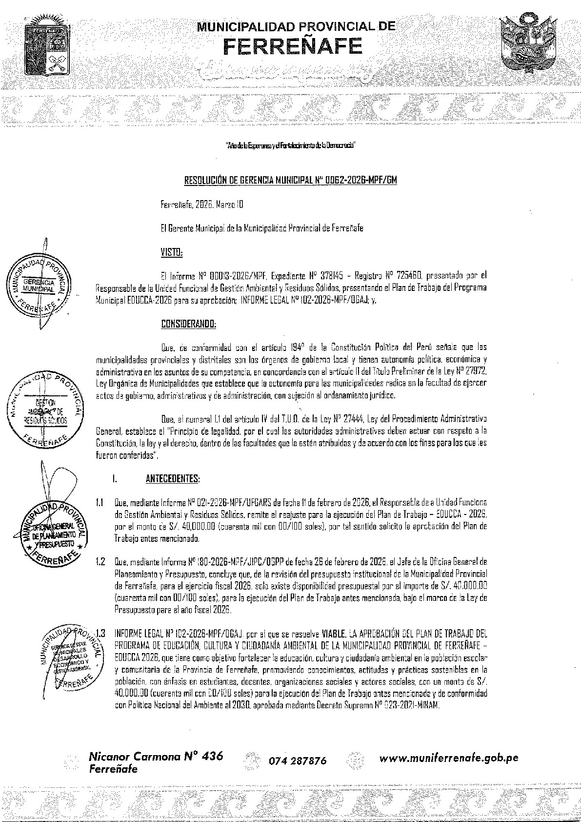La presente Resolución de Gerencia Municipal aprueba el Plan de Trabajo 2026 del Programa Municipal de Educación, Cultura y Ciudadanía Ambiental de la Municipalidad Provincial de Ferreñafe (Lambayeque), con la finalidad de definir las actividades de educación, cultura y ciudadanía ambiental que se desarrollarán en la localidad durante el presente año.