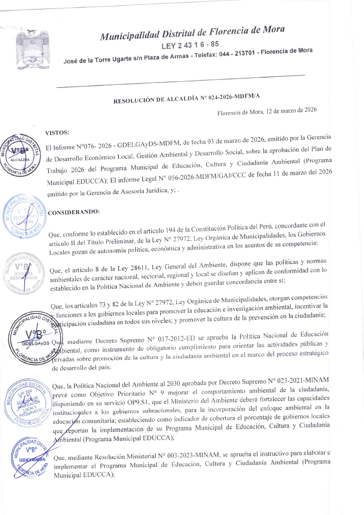 La presente Resolución de Alcaldia aprueba el Plan de Trabajo 2026 del Programa Municipal de Educación, Cultura y Ciudadanía Ambiental de la Municipalidad Distrital de Florencia de Mora (Trujillo - La Libertad), con la finalidad de definir las actividades de educación, cultura y ciudadanía ambiental que se desarrollarán en la localidad durante el presente año.