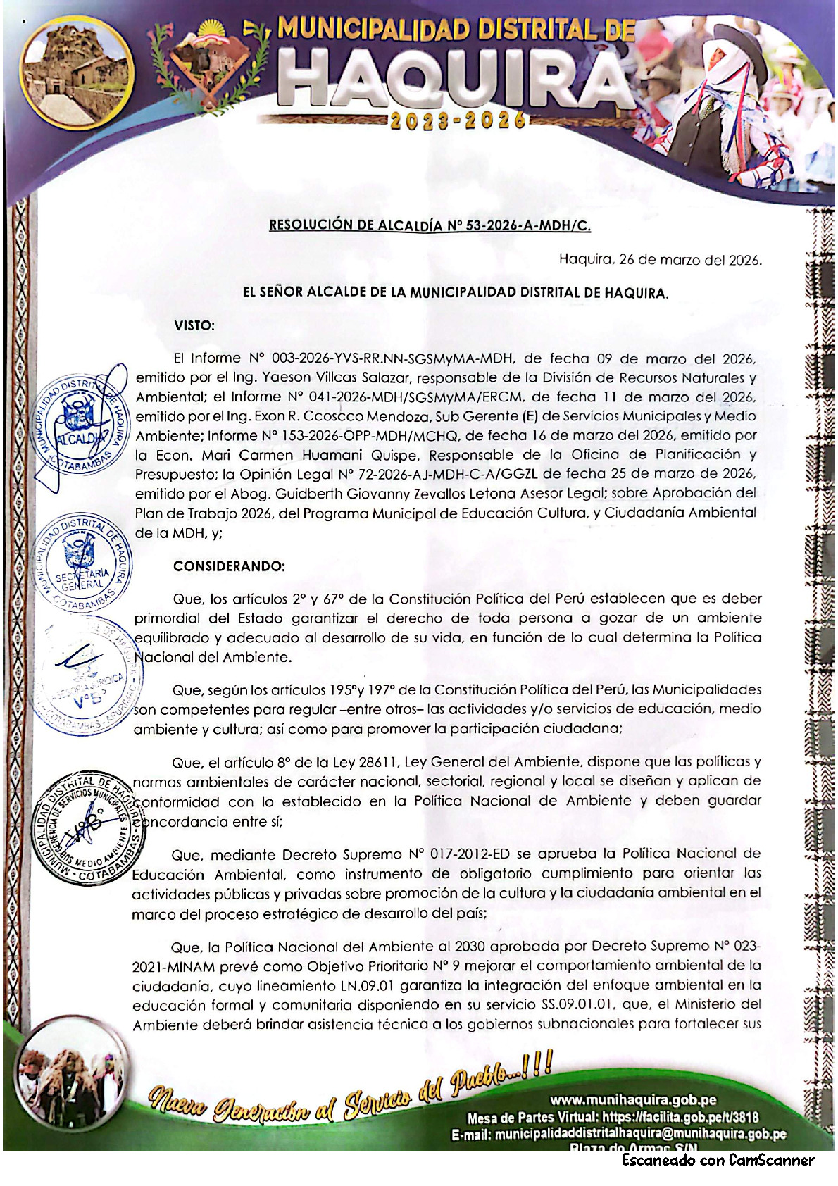 La presente Resolución de Alcaldía aprueba el Plan de Trabajo 2026 del Programa Municipal de Educación, Cultura y Ciudadanía Ambiental de la Municipalidad Distrital de Haquira (Cotabambas - Apurímac), con la finalidad de definir las actividades de educación, cultura y ciudadanía ambiental que se desarrollarán en la localidad durante el presente año.