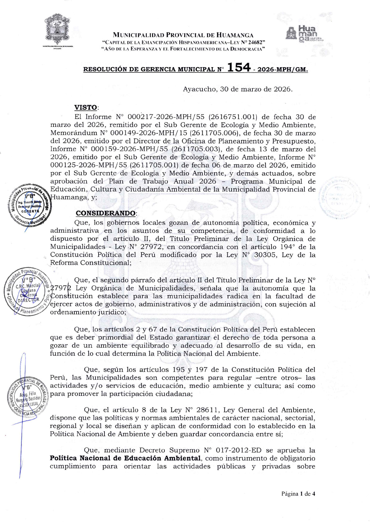 La presente Resolución de Gerencia Municipal aprueba el Plan de Trabajo 2026 del Programa Municipal de Educación, Cultura y Ciudadanía Ambiental de la Municipalidad Provincial de Huamanga - Huamanga (Ayacucho), con la finalidad de definir las actividades de educación, cultura y ciudadanía ambiental que se desarrollarán en la localidad durante el presente año.