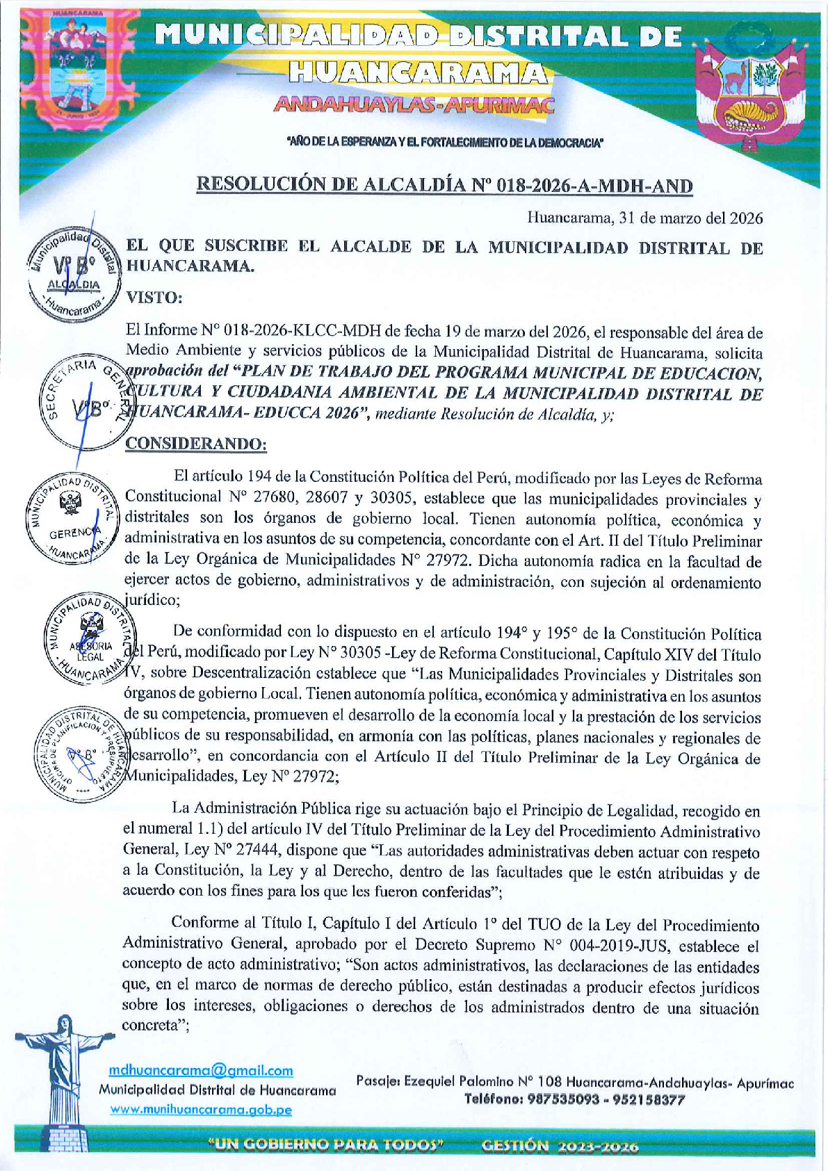 La presente Resolución de Alcaldia aprueba el Plan de Trabajo 2026 del Programa Municipal de Educación, Cultura y Ciudadanía Ambiental de la Municipalidad Distrital de Huancarama (Andahuaylas - Apurimac), con la finalidad de definir las actividades de educación, cultura y ciudadanía ambiental que se desarrollarán en la localidad durante el presente año.