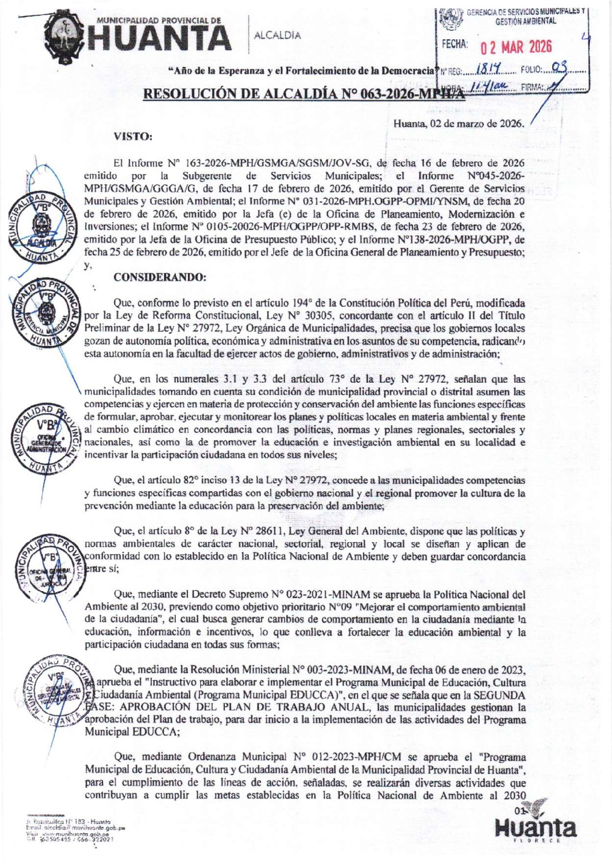 La presente Resolución de Alcaldía aprueba el Plan de Trabajo 2026 del Programa Municipal de Educación, Cultura y Ciudadanía Ambiental de la Municipalidad Provincial de Huanta - Huanta (Ayacucho), con la finalidad de definir las actividades de educación, cultura y ciudadanía ambiental que se desarrollarán en la localidad durante el presente año.