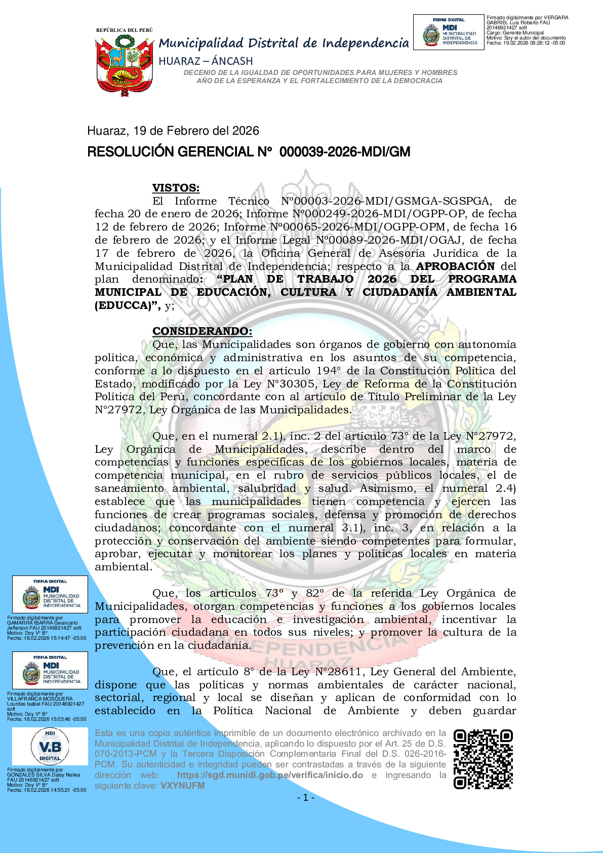 La presente Resolución de Gerencia Municipal aprueba el Plan de Trabajo 2026 del Programa Municipal de Educación, Cultura y Ciudadanía Ambiental de la Municipalidad Distrital de Independencia (Huaraz - Ancash), con la finalidad de definir las actividades de educación, cultura y ciudadanía ambiental que se desarrollarán en la localidad durante el presente año.