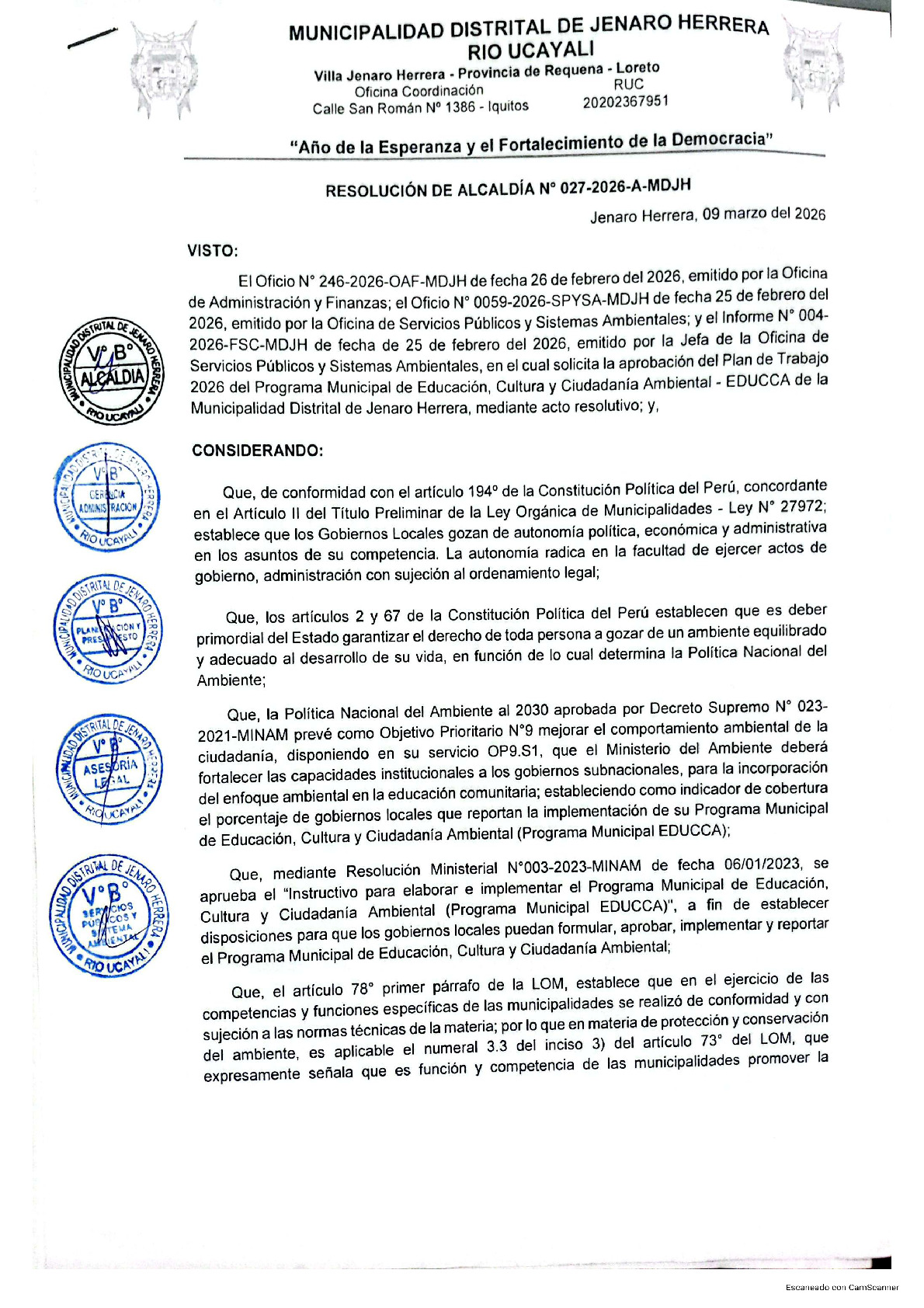 La presente Resolución de Alcaldia aprueba el Plan de Trabajo 2026 del Programa Municipal de Educación, Cultura y Ciudadanía Ambiental de la Municipalidad Disitrital de Jenaro Herrera (Requena - Loreto), con la finalidad de definir las actividades de educación, cultura y ciudadanía ambiental que se desarrollarán en la localidad durante el presente año.