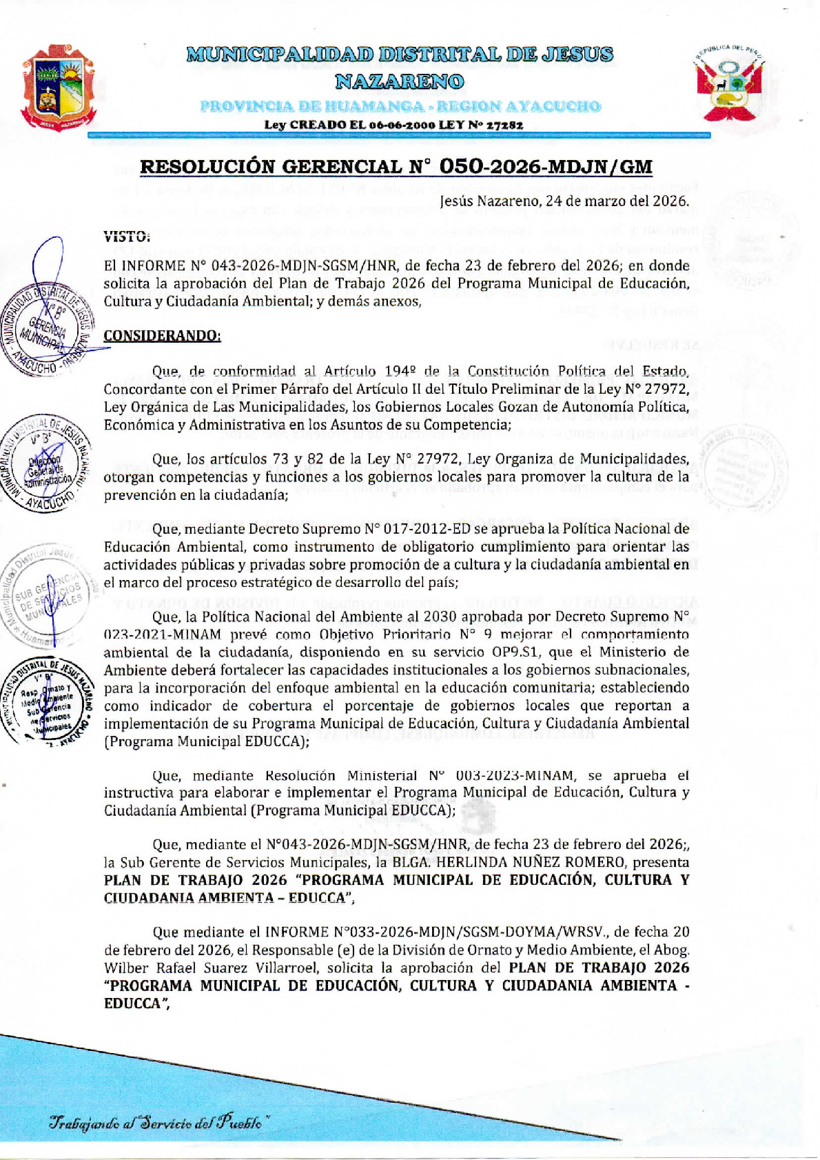 La presente Resolución de Gerencia Municipal aprueba el Plan de Trabajo 2026 del Programa Municipal de Educación, Cultura y Ciudadanía Ambiental de la Municipalidad Distrital de Jesús Nazareno - Huamanga (Ayacucho), con la finalidad de definir las actividades de educación, cultura y ciudadanía ambiental que se desarrollarán en la localidad durante el presente año.