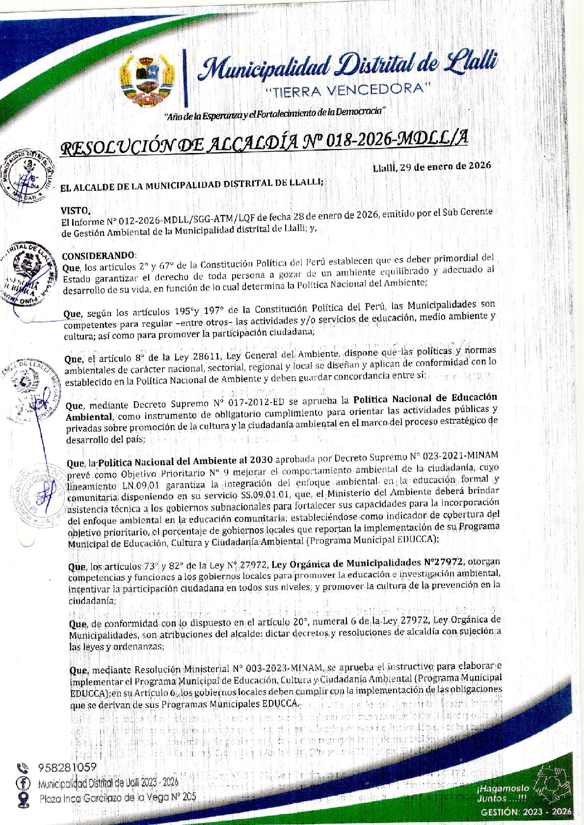 La presente Resolución de Alcaldía aprueba el Plan de Trabajo 2026 del Programa Municipal de Educación, Cultura y Ciudadanía Ambiental de la Municipalidad Distrital de Llalli - Melgar (Puno), con la finalidad de definir las actividades de educación, cultura y ciudadanía ambiental que se desarrollarán en la localidad durante el presente año.