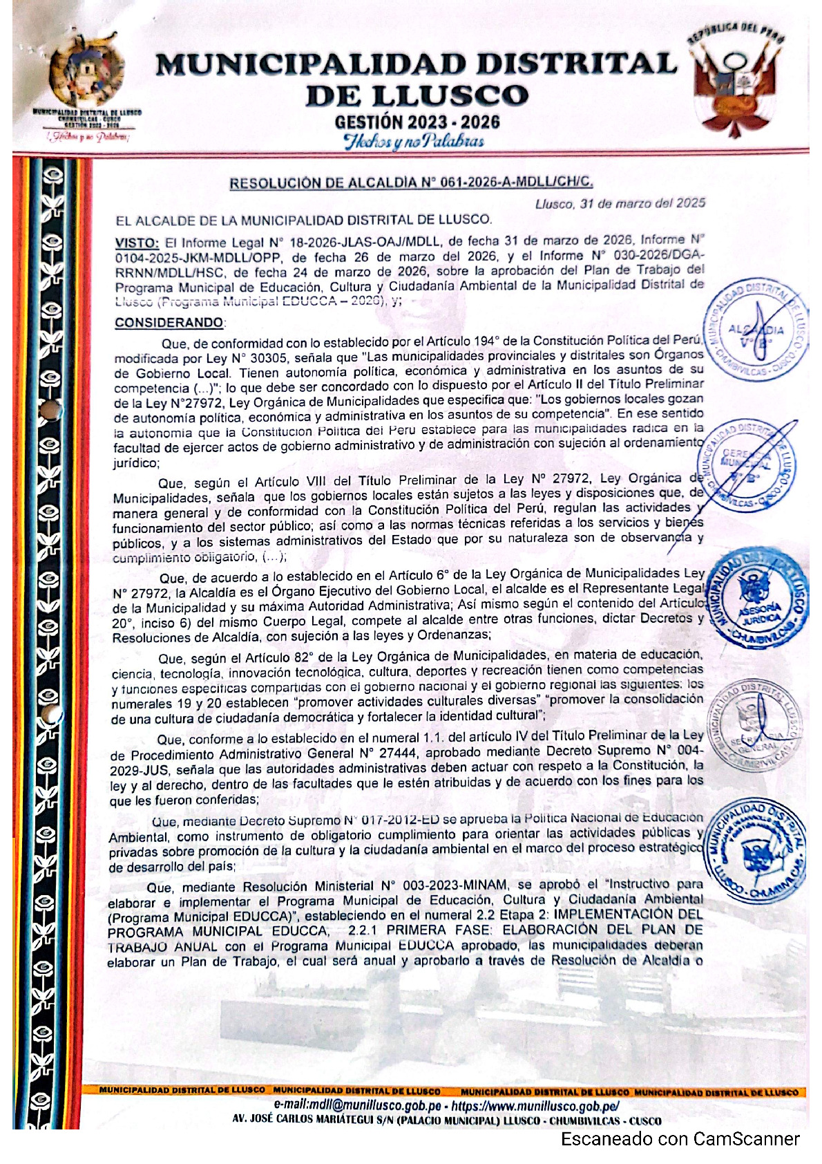 La presente Resolución de Alcaldía aprueba el Plan de Trabajo 2026 del Programa Municipal de Educación, Cultura y Ciudadanía Ambiental de la Municipalidad Distrital de Llusco - Chumbivilcas (Cusco), con la finalidad de definir las actividades de educación, cultura y ciudadanía ambiental que se desarrollarán en la localidad durante el presente año.