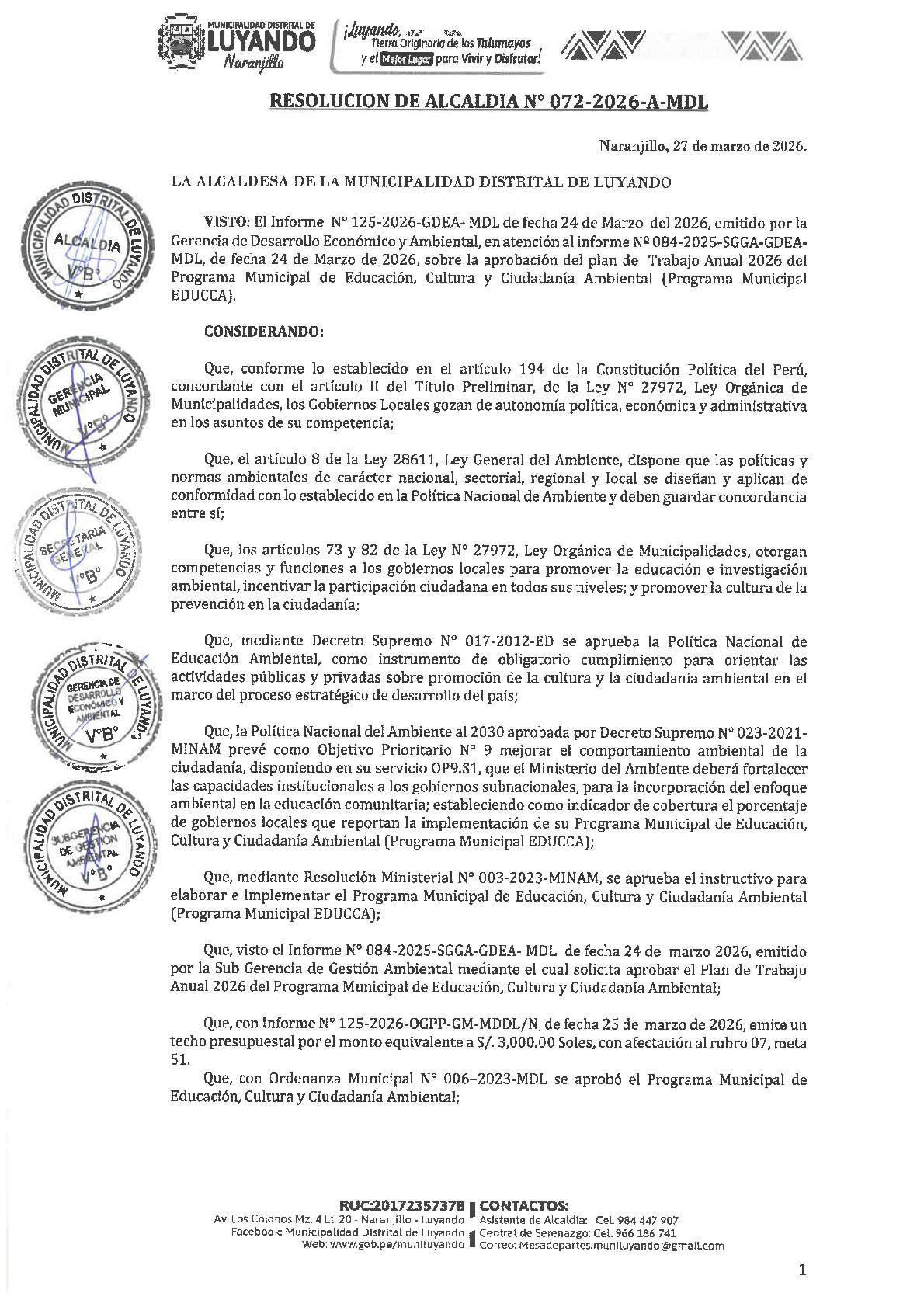 La presente Resolución de Alcaldia aprueba el Plan de Trabajo 2026 del Programa Municipal de Educación, Cultura y Ciudadanía Ambiental de la Municipalidad Disitrital de Luyando (Leoncio Prado - Huánuco), con la finalidad de definir las actividades de educación, cultura y ciudadanía ambiental que se desarrollarán en la localidad durante el presente año.