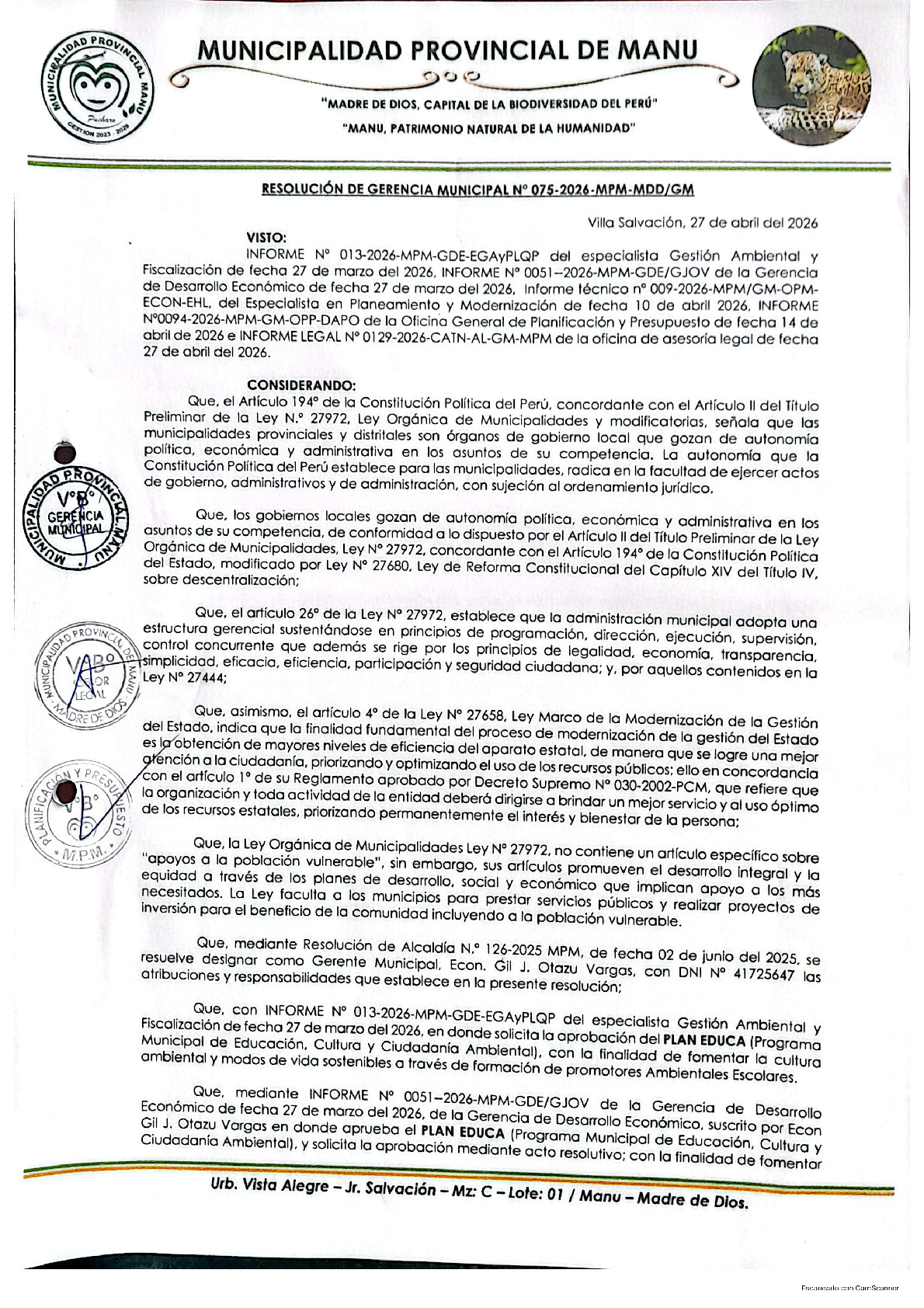 La presente Resolución de Gerencia Municipal aprueba el Plan de Trabajo 2026 del Programa Municipal de Educación, Cultura y Ciudadanía Ambiental de la Municipalidad Provincial de Manú - Manú (Madre de Dios), con la finalidad de definir las actividades de educación, cultura y ciudadanía ambiental que se desarrollarán en la localidad durante el presente año.