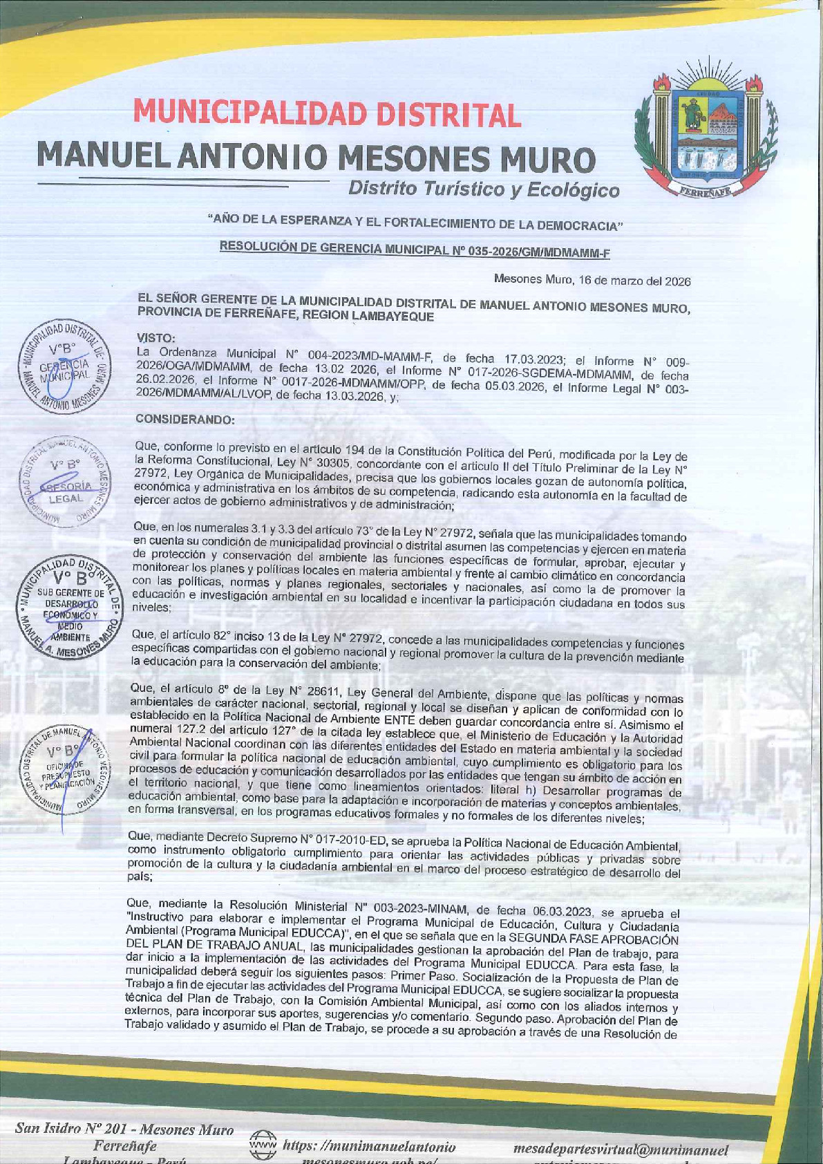 La presente Resolución de Gerencia Municipal aprueba el Plan de Trabajo 2026 del Programa Municipal de Educación, Cultura y Ciudadanía Ambiental de la Municipalidad Distrital de Manuel Antonio Mesones Muro (Ferreñafe - Lambayeque), con la finalidad de definir las actividades de educación, cultura y ciudadanía ambiental que se desarrollarán en la localidad durante el presente año.