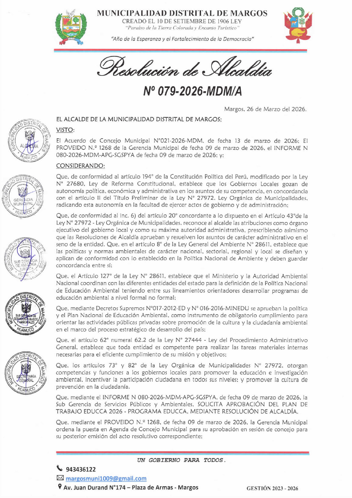 La presente Resolución de Alcaldia aprueba el Plan de Trabajo 2026 del Programa Municipal de Educación, Cultura y Ciudadanía Ambiental de la Municipalidad Distrital de Margos (Huánuco - Huánuco), con la finalidad de definir las actividades de educación, cultura y ciudadanía ambiental que se desarrollarán en la localidad durante el presente año.