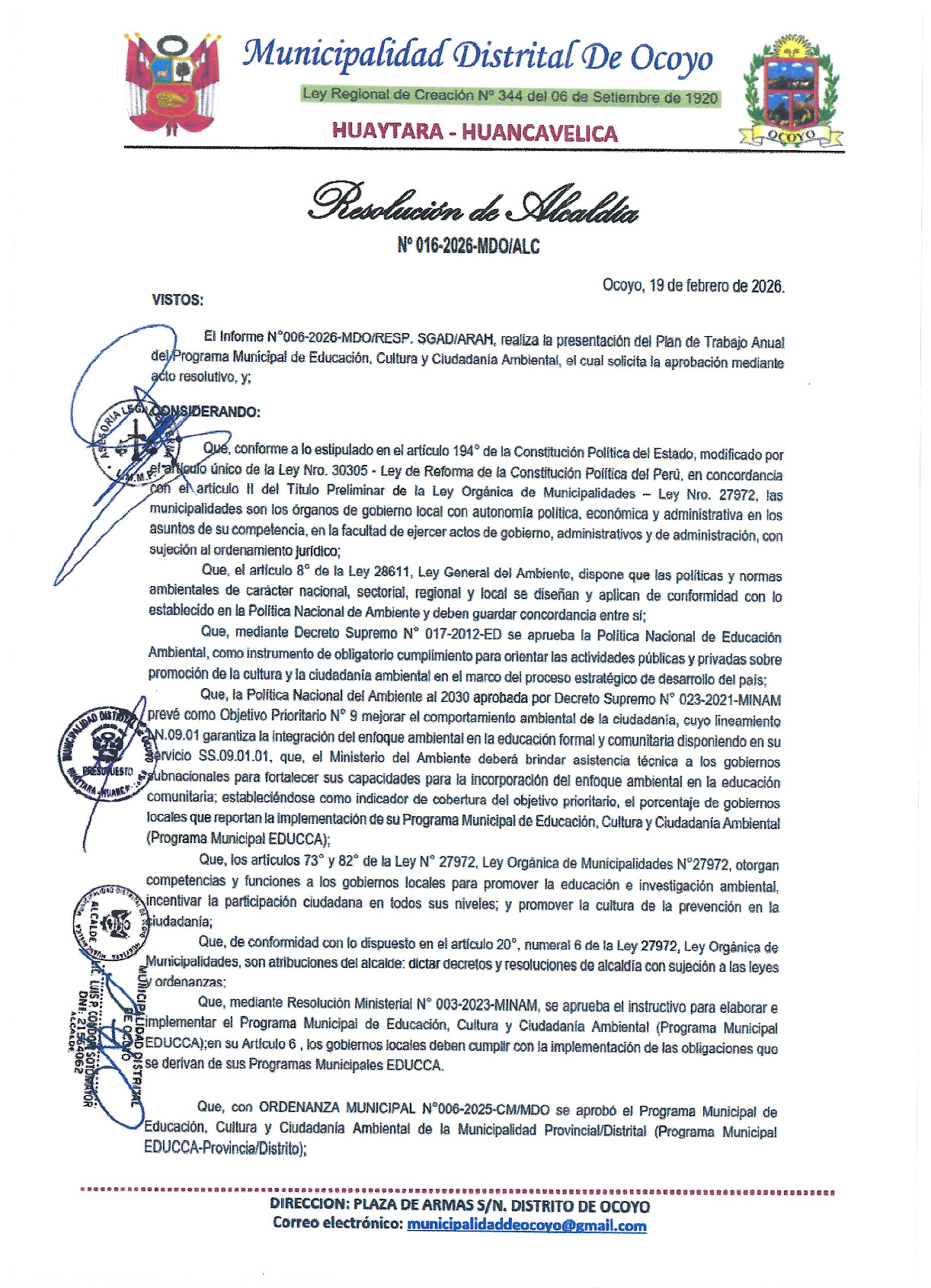 La presente Resolución de Alcaldía aprueba el Plan de Trabajo 2026 del Programa Municipal de Educación, Cultura y Ciudadanía Ambiental de la Municipalidad Distrital de Ocoyo-Huaytará (Huancavelica), con la finalidad de
