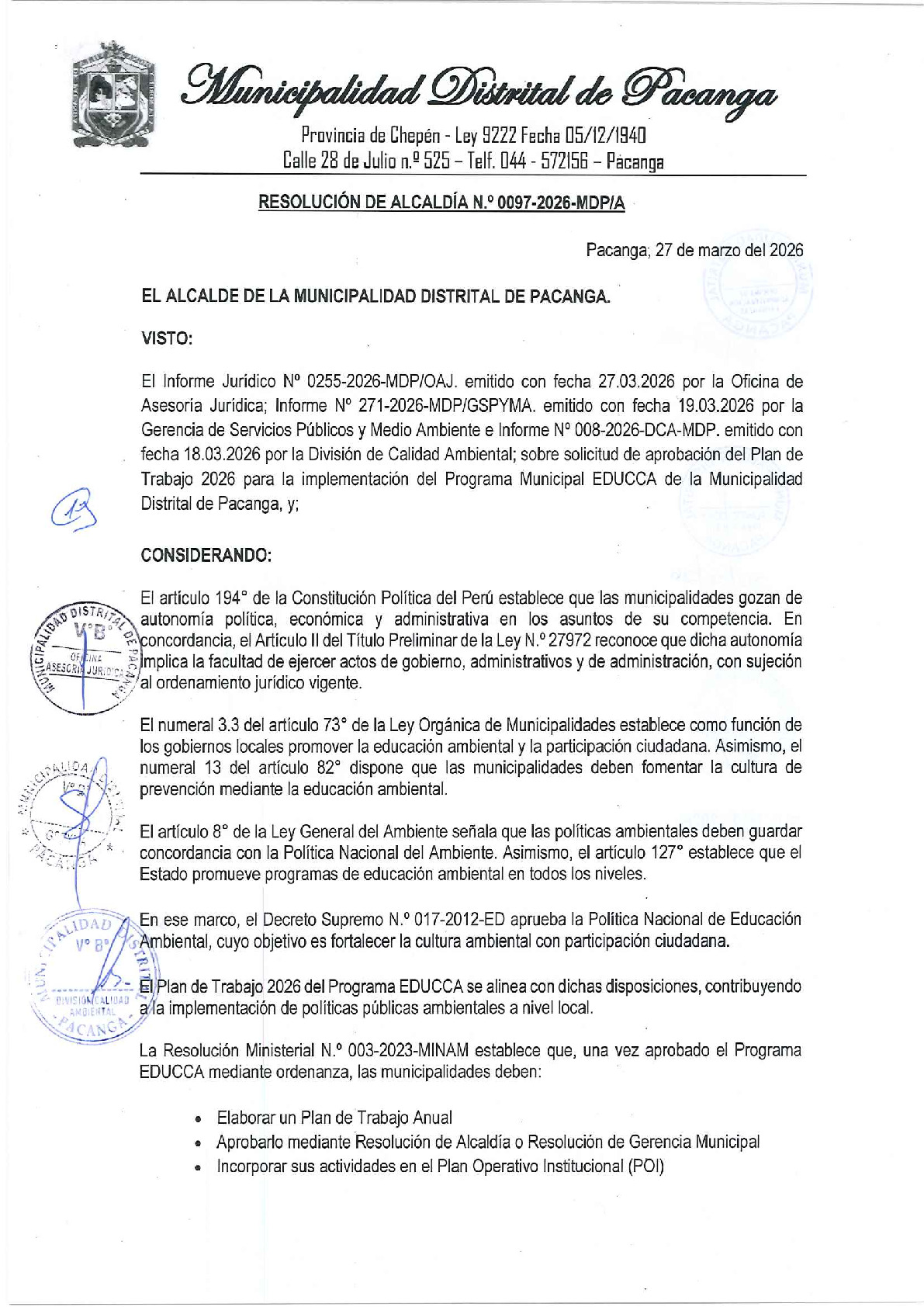 La presente Resolución de Alcaldia aprueba el Plan de Trabajo 2026 del Programa Municipal de Educación, Cultura y Ciudadanía Ambiental de la Municipalidad Distrital de Pacanga (Chepen - La Libertad), con la finalidad de definir las actividades de educación, cultura y ciudadanía ambiental que se desarrollarán en la localidad durante el presente año.