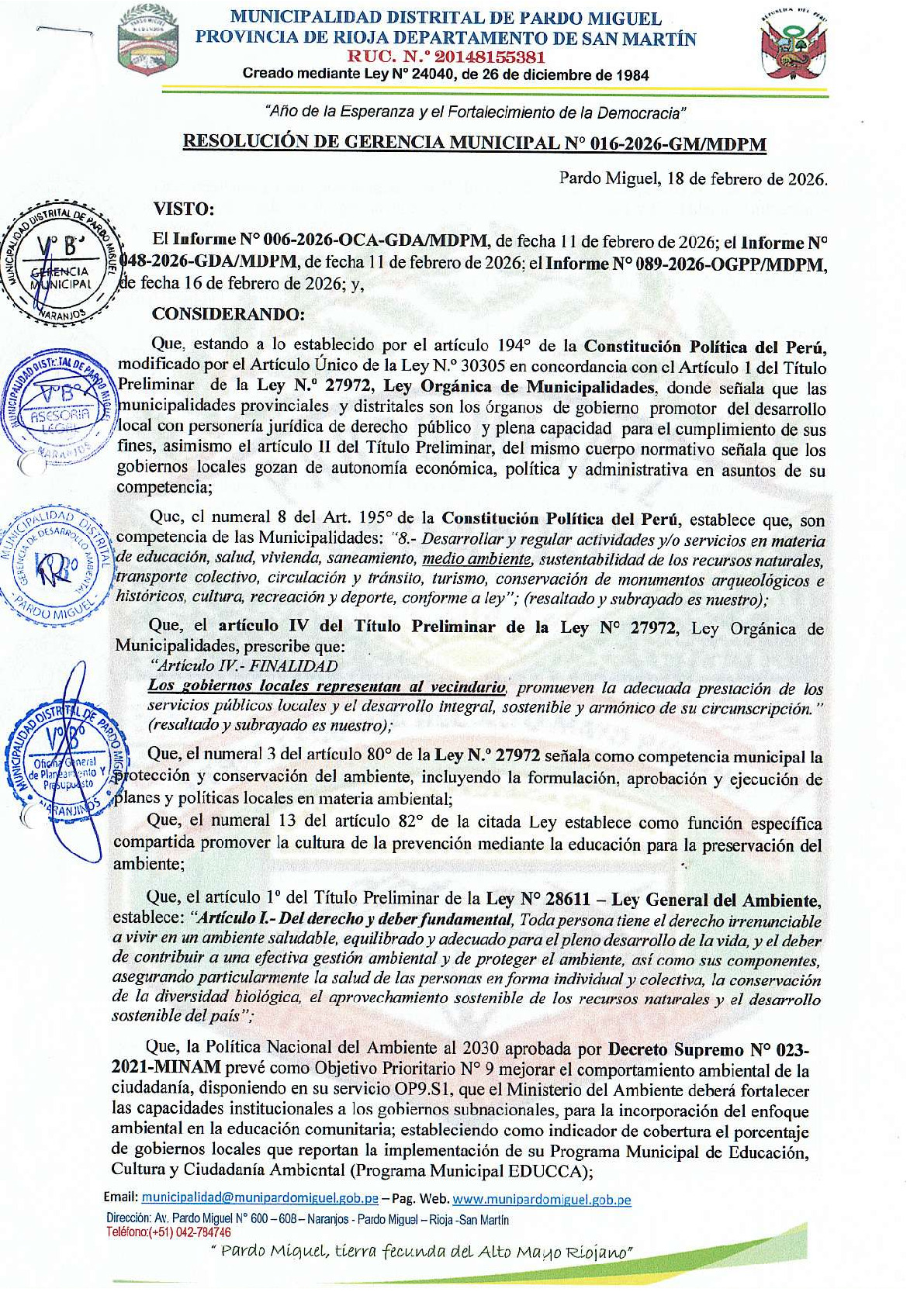 La presente Resolución de Gerente Municipal aprueba el Plan de Trabajo 2026 del Programa Municipal de Educación, Cultura y Ciudadanía Ambiental de la Municipalidad Distrital de Pardo Miguel (Rioja - San Martin), con la finalidad de definir las actividades de educación, cultura y ciudadanía ambiental que se desarrollarán en la localidad durante el presente año.