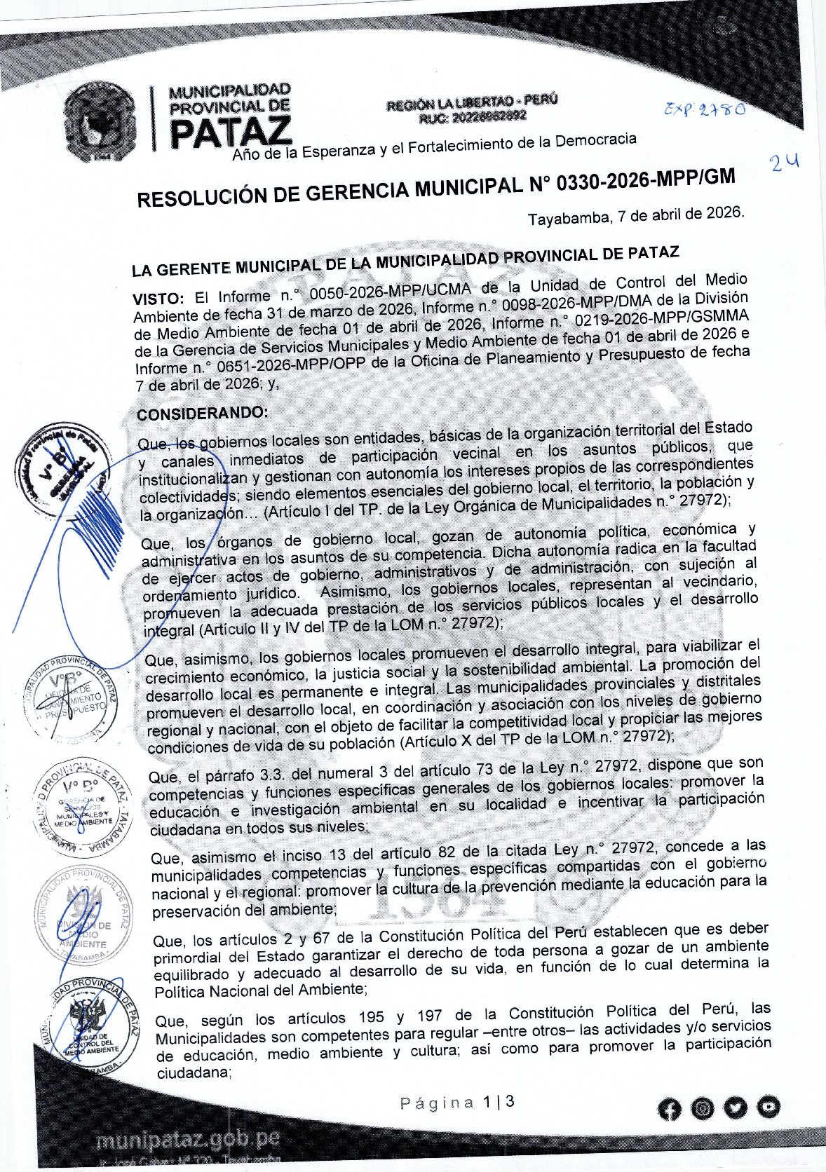 La presente Resolución de Gerencia Municipal aprueba el Plan de Trabajo 2026 del Programa Municipal de Educación, Cultura y Ciudadanía Ambiental de la Municipalidad Provincial de Pataz (La Libertad), con la finalidad de definir las actividades de educación, cultura y ciudadanía ambiental que se desarrollarán en la localidad durante el presente año.