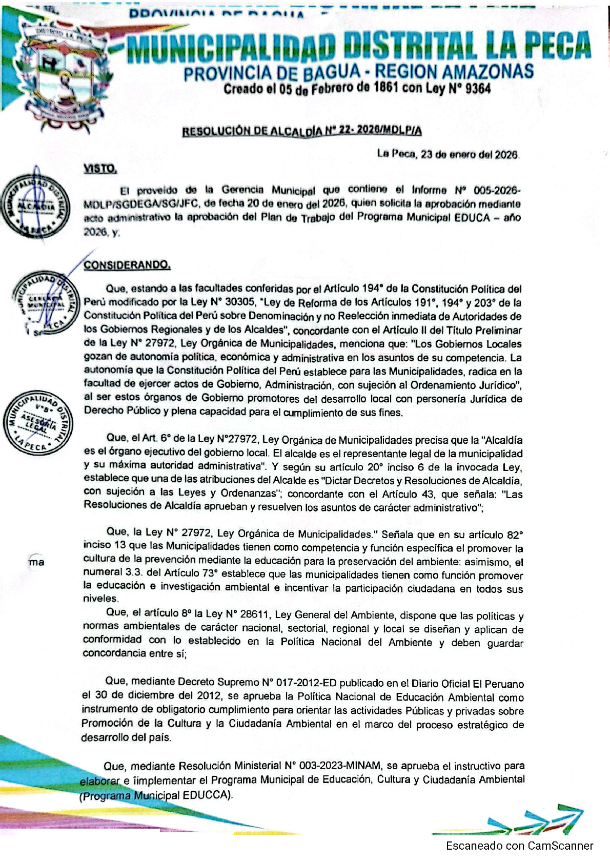 La presente Resolución de Alcaldia aprueba el Plan de Trabajo 2026 del Programa Municipal de Educación, Cultura y Ciudadanía Ambiental de la Municipalidad Distrital de La Peca (Bagua - Amazonas), con la finalidad de definir las actividades de educación, cultura y ciudadanía ambiental que se desarrollarán en la localidad durante el presente año.