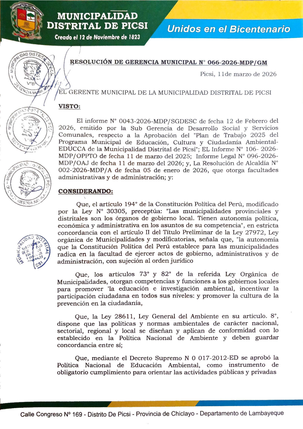 La presente Resolución de Gerencia Municipal aprueba el Plan de Trabajo 2026 del Programa Municipal de Educación, Cultura y Ciudadanía Ambiental de la Municipalidad Distrital de Picsi (Chiclayo - Lambayeque), con la finalidad de definir las actividades de educación, cultura y ciudadanía ambiental que se desarrollarán en la localidad durante el presente año.