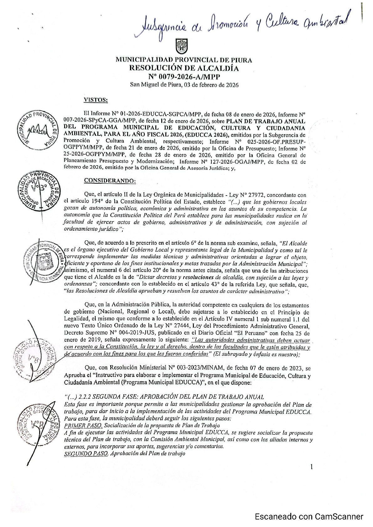 La presente Resolución de Alcaldía aprueba el Plan de Trabajo 2026 del Programa Municipal de Educación, Cultura y Ciudadanía Ambiental de la Municipalidad Provincial de Piura (Piura), con la finalidad de definir las actividades de educación, cultura y ciudadanía ambiental que se desarrollarán en la localidad durante el presente año.