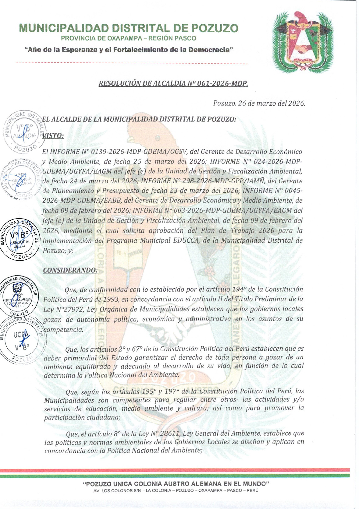 La presente Resolución de Alcaldía aprueba el Plan de Trabajo 2026 del Programa Municipal de Educación, Cultura y Ciudadanía Ambiental de la Municipalidad Distrital de Pozuzo - Oxapampa (Pasco), con la finalidad de definir las actividades de educación, cultura y ciudadanía ambiental que se desarrollarán en la localidad durante el presente año.