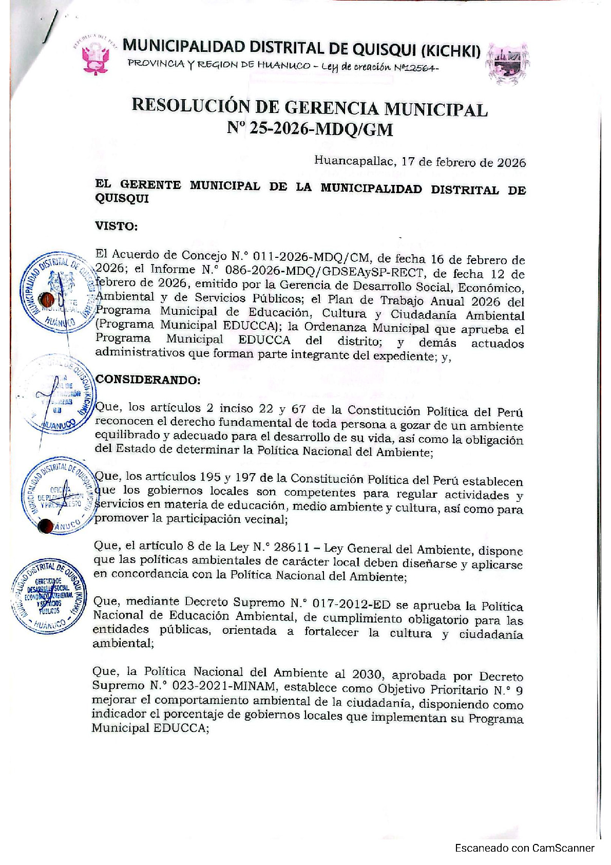 La presente Resolución de Gerencia Municipal aprueba el Plan de Trabajo 2026 del Programa Municipal de Educación, Cultura y Ciudadanía Ambiental de la Municipalidad Distrital de Quisqui (Huánuco - Huánuco), con la finalidad de definir las actividades de educación, cultura y ciudadanía ambiental que se desarrollarán en la localidad durante el presente año.