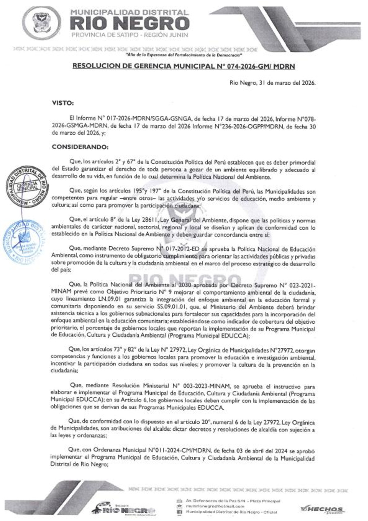 La presente Resolución de Gerencia Municipal aprueba el Plan de Trabajo 2026 del Programa Municipal de Educación, Cultura y Ciudadanía Ambiental de la Municipalidad Distrital de Río Negro-Satipo (Junín), con la finalidad de definir las actividades de educación, cultura y ciudadanía ambiental que se desarrollarán en la localidad durante el presente año.