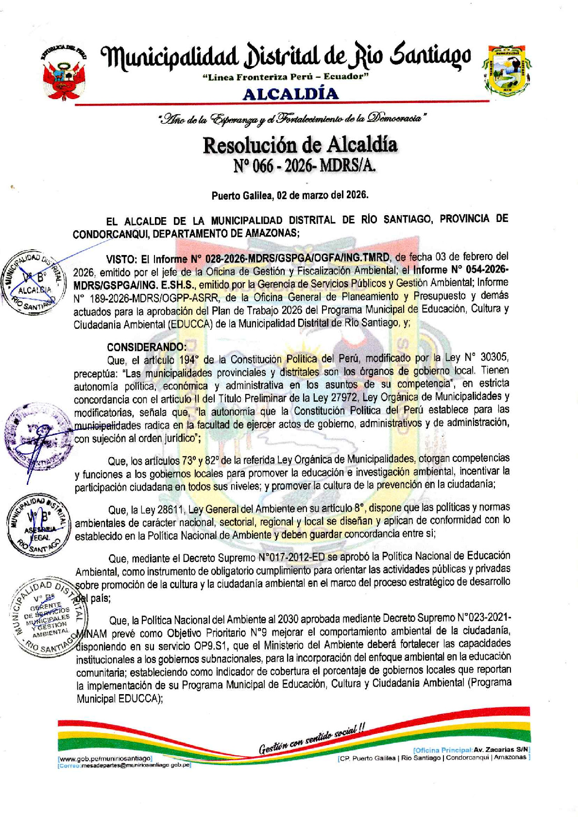 La presente Resolución de Alcaldía aprueba el Plan de Trabajo 2026 del Programa Municipal de Educación, Cultura y Ciudadanía Ambiental de la Municipalidad Distrital de Rio Santiago (Condorcanqui - Amazonas), con la finalidad de definir las actividades de educación, cultura y ciudadanía ambiental que se desarrollarán en la localidad durante el presente año.