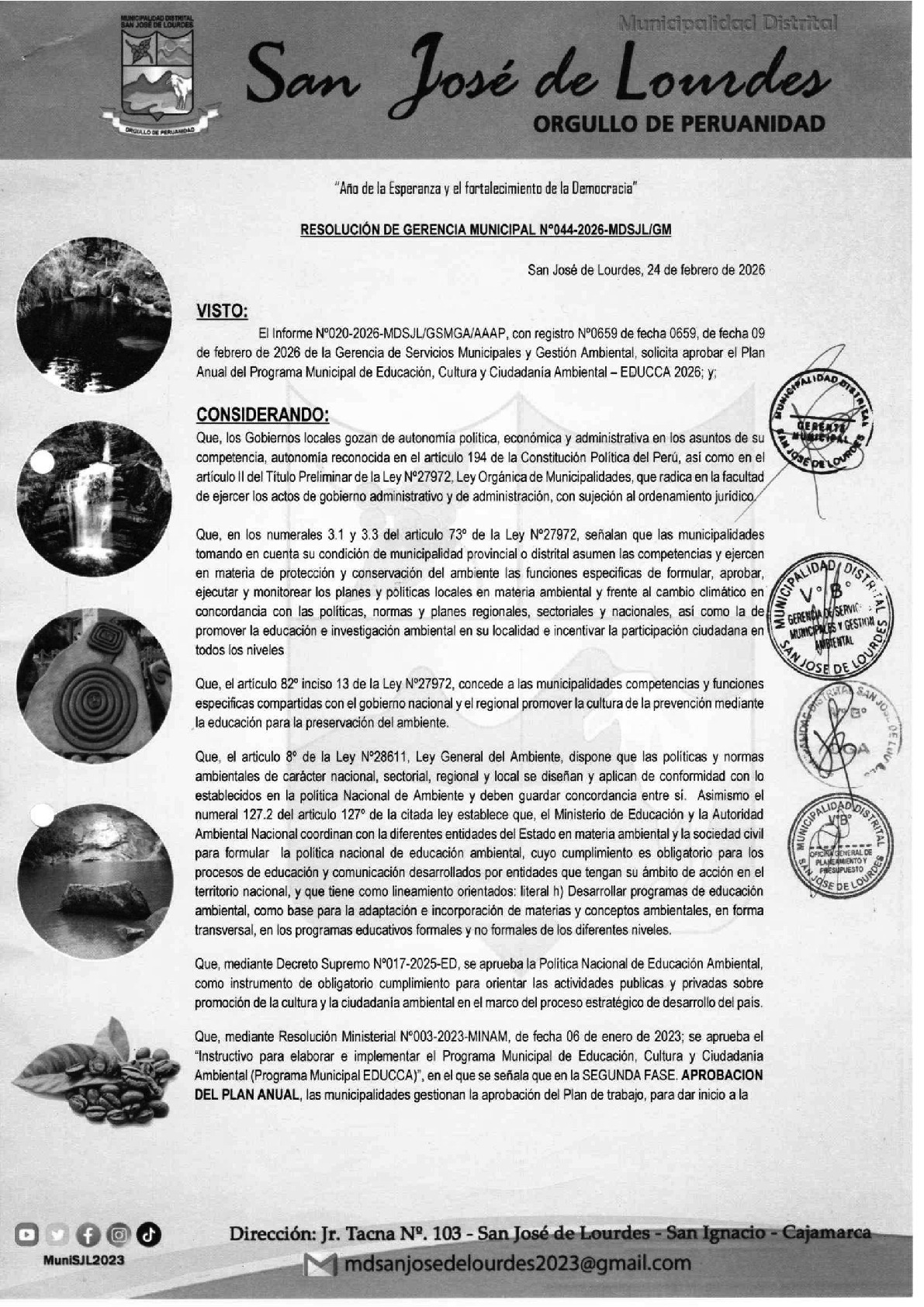 La presente Resolución de Gerencia Municipal aprueba el Plan de Trabajo 2026 del Programa Municipal de Educación, Cultura y Ciudadanía Ambiental de la Municipalidad Distrital de San José de Lourdes (San Ignacio - Cajamarca), con la finalidad de definir las actividades de educación, cultura y ciudadanía ambiental que se desarrollarán en la localidad durante el presente año.